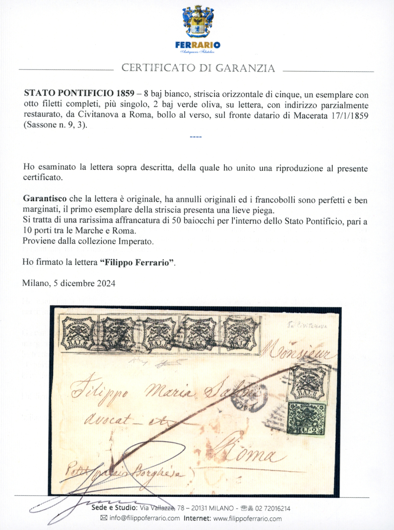 1859 - 8 baj bianco, striscia orizzontale di cinque, un esemplare con otto filetti completi, più singolo, 2 baj verde oliva (9,3), perfetti e ben marginati, lieve piega solo sul primo esemplare della striscia, su lettera, con indirizzo parzialmente restaurato, da Civitanova a Roma, bollo al verso, sul fronte datario di Macerata 17/1/1859. Rarissima affrancatura di 50 baiocchi, per l'interno dello Stato Pontificio, pari a 10 porti tra le Marche e Roma. Chiavarello, cert. Ferrario. Ex. Coll. Imperato.