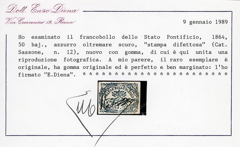 1864 - 50 baj azzurro oltremare scuro, stampa difettosa (12), nuovo, gomma originale, perfetto, Molto fresco, margini enormi. Sicuramente uno dei migliori esemplari esistenti allo stato di nuovo. Rarità. Emilio ed Alberto Diena per esteso, cert. Enzo Diena e finanziario Bolaffi 70%.