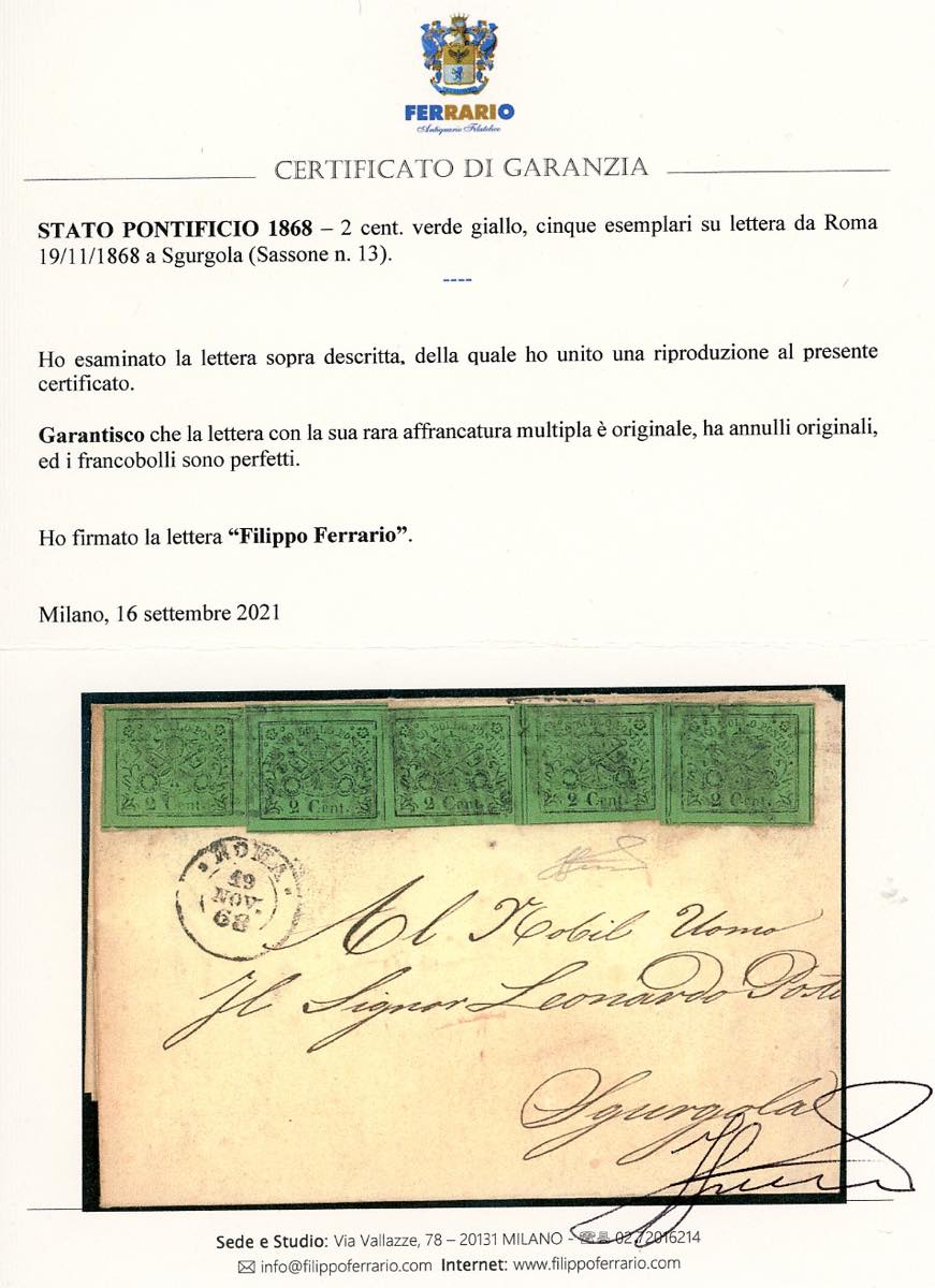 1868 - 2 cent. verde giallo (13), cinque esemplari, perfetti e ben marginati, su lettera da Roma 19/11/1868 a Sgurgola. Rara affrancatura multipla, frutto di un recente ritrovamento d'archivio. Cert. Ferrario.
