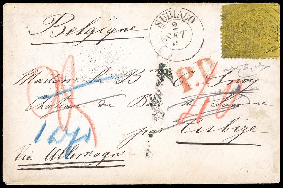 1859 - 40 cent. giallo (29b), su busta da Subiaco 2/09/1869 a Tubize in Germania, bollo corsivo "insufficiente" e numerosi segni di tassa. ... Leggi tutto