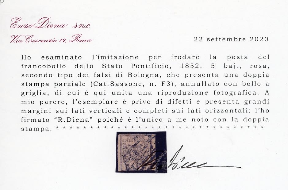 1855 - 5 baj rosa, falso per posta di Bologna, II tipo, DOPPIA STAMPA PARZIALE (F3), grandi margini verticali, leggermente intaccato in basso, usato. Rarità del settore, unico esemplare noto di questa varietà, ad oggi non catalogata. Cert. Diena.