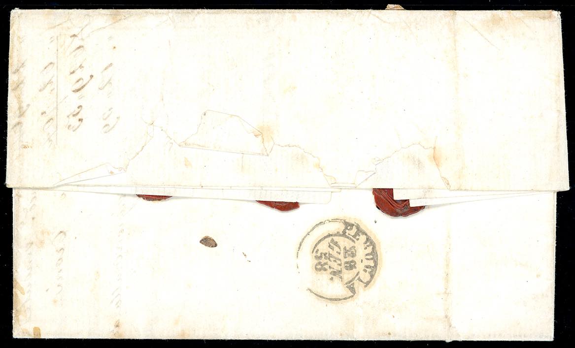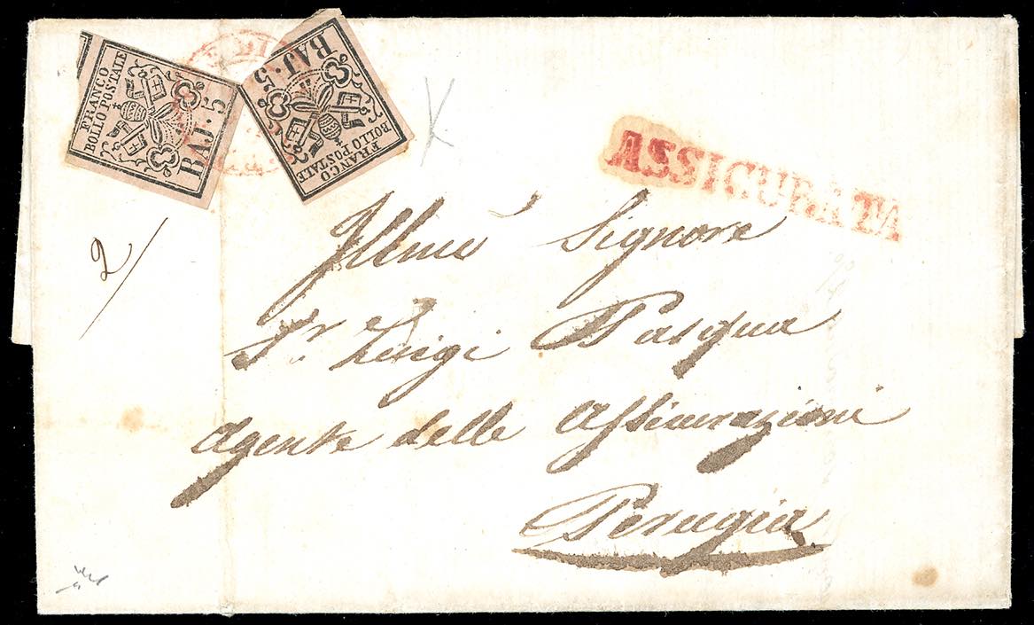 ROMA, Dir. + ASS in rosso punti R1 -5 baj (6), due esemplari, difetti di marginatura, su lettera assicurata del 23/1/1858 a Perugia. Rara. Chiavarello, Bottacchi. Ex coll. Imperato.