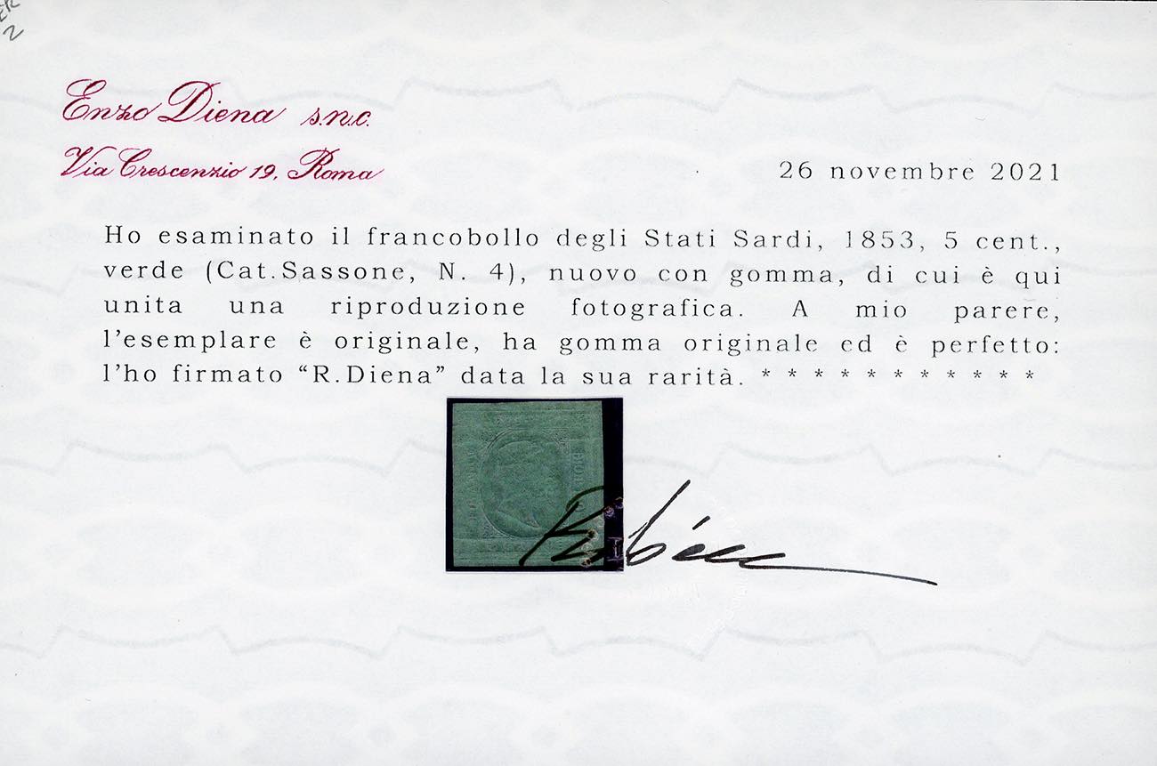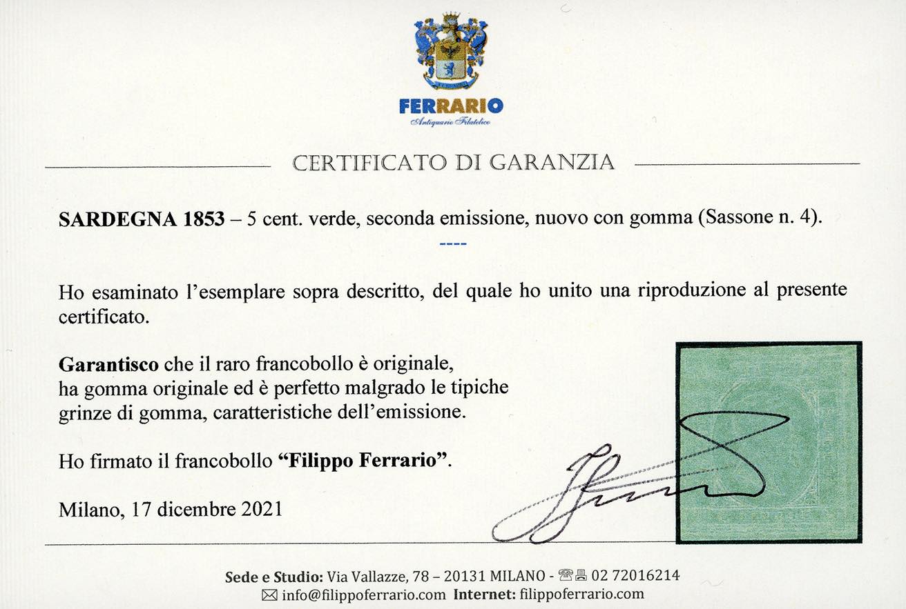 1853 - 5 cent. verde (4), nuovo, gomma originale, perfetto, consuete lievi grinze di gomma. Raro! A.Diena, cert. Diena e Ferrario.