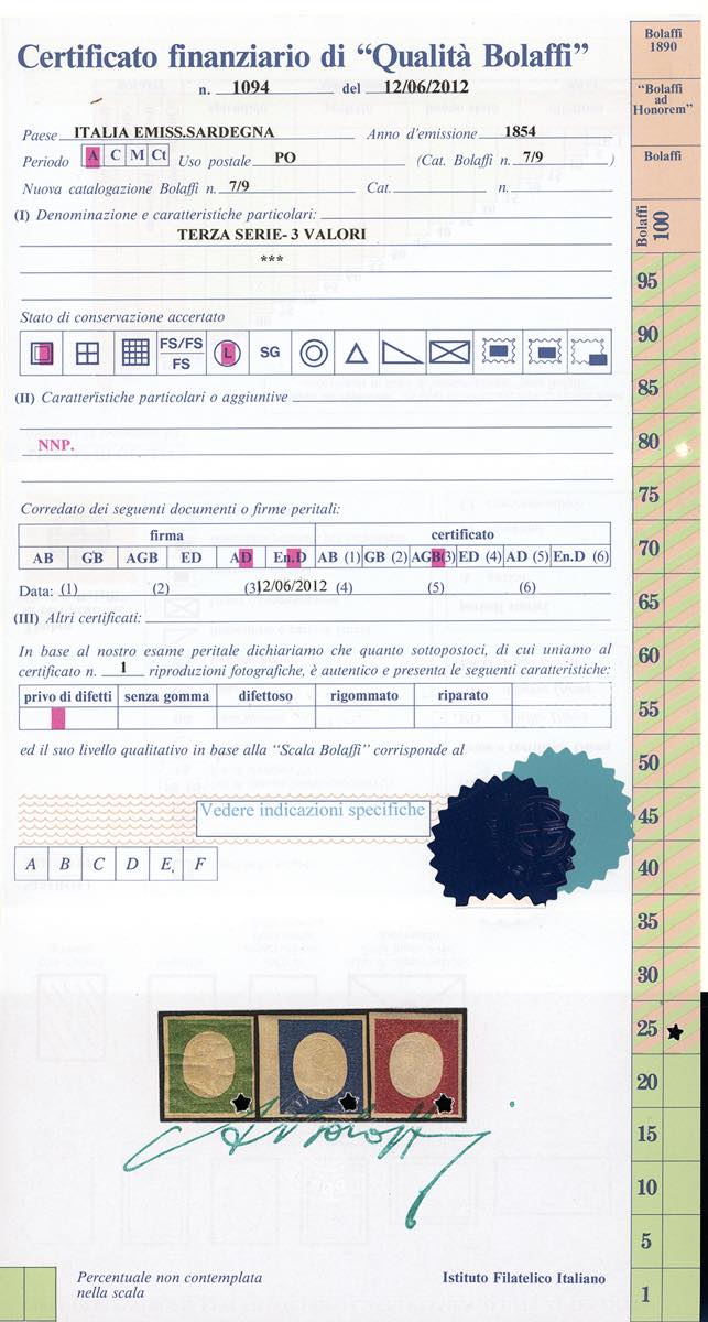 1854 - Terza emissione, non emessi (10/12), gomma originale, lieve traccia di linguella, perfetti. Ottima qualità. E.Diena per il 5 cent., A.Diena e cert. Finanziario Bolaffi 80% per tutti.