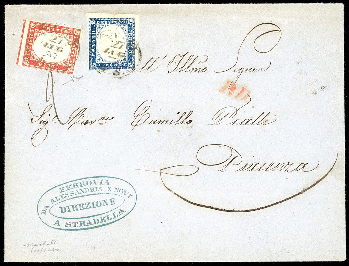 1857 - 40 cent. rosso scarlatto, perfetto, 20 cent. azzurro grigiastro leggermente sfiorato in basso (16A,15A), su busta di doppio porto da Torino 27/7/1857 a Piacenza nel Ducato di Parma. Non comune. Chiavarello. Ex coll. Imperato.