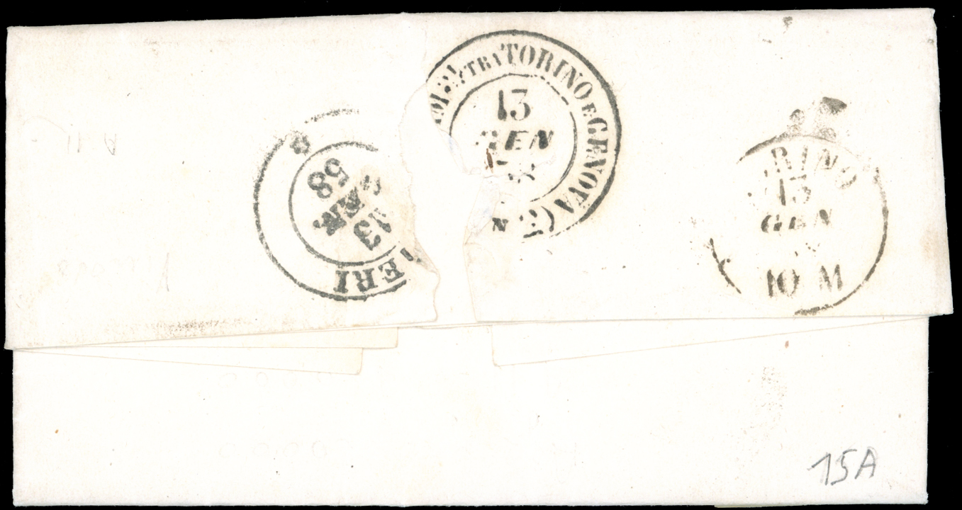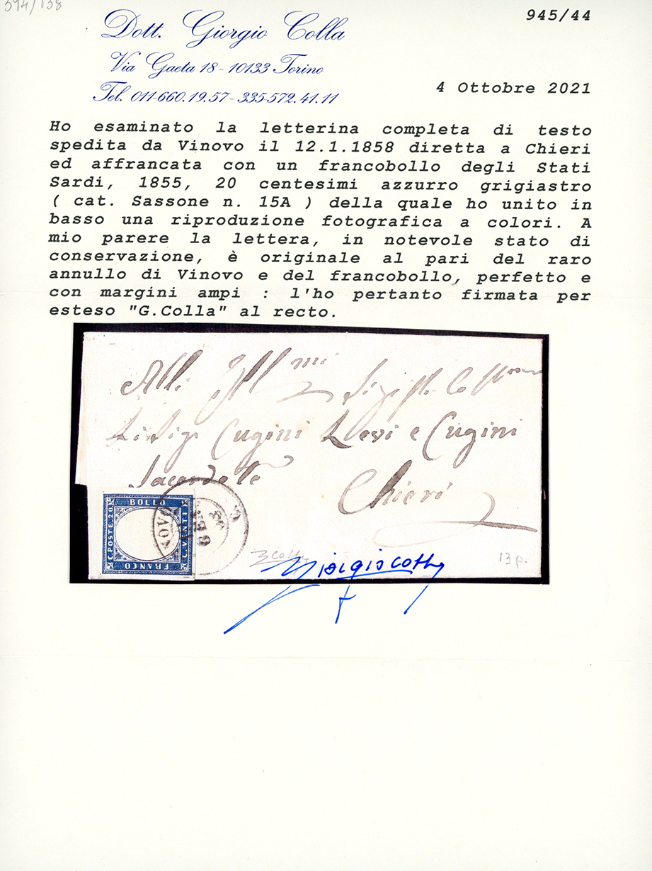 PIEMONTE-VINOVO, punti 13 - 20 cent. (15A), perfetto, su lettera del 12/1/1858 per Chieri. Rara e di ottima qualità. Cert. Colla.