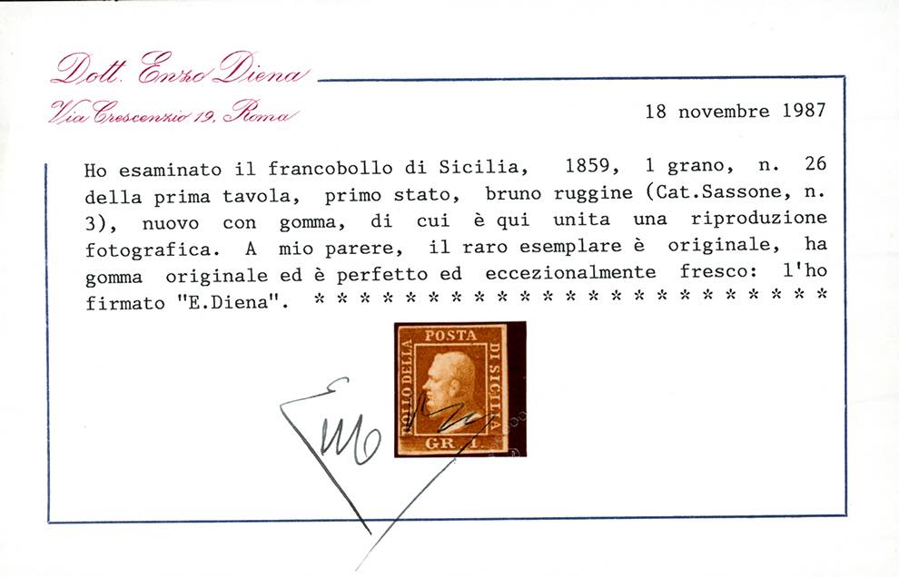 1859 - 1 grano bruno ruggine, I tavola, I stato (3), gomma originale, perfetto. Molto raro e di eccezionale freschezza. Em.Diena, cert. E.Diena e Ferrario.