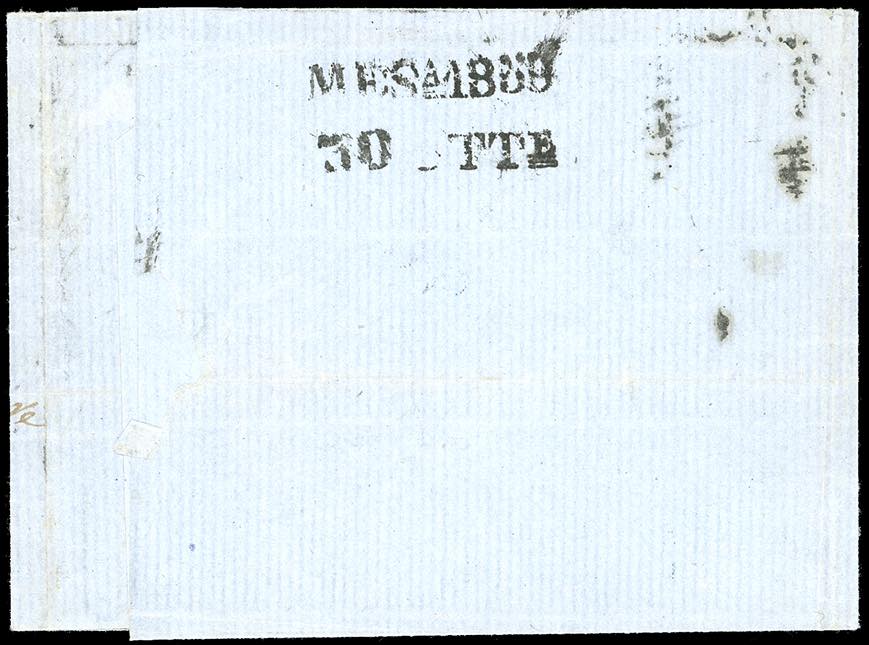 1859 - 2 grana azzurro, I tavola, carta di Palermo, posiz. 15 e 2 grana azzurro vivo, I tavola, carta di Napoli, posiz. 32 (6+6f), perfetti, su fresca sovracoperta di lettera da Catania 2/10/1859 a Messina. Bella e rara affrancatura di valori gemelli con tinte differenti. E.Diena, Raybaudi, cert. Ferrario. Ex coll. Imperato.