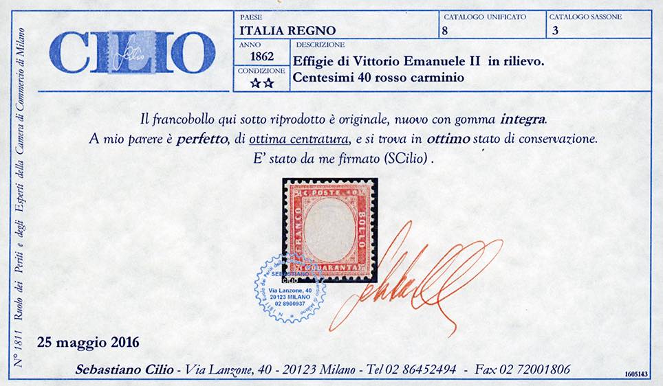 1862 - 40 cent. rosso carminio (3), nuovo, gomma originale integra, perfetto e ben centrato. Molto bello. Ferrario, cert. Cilio.