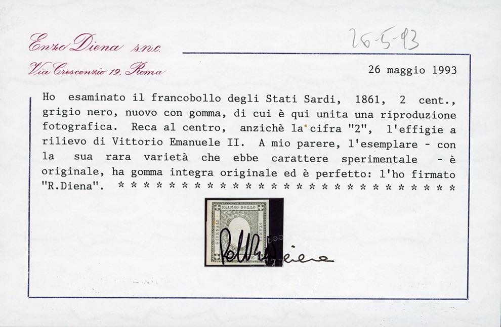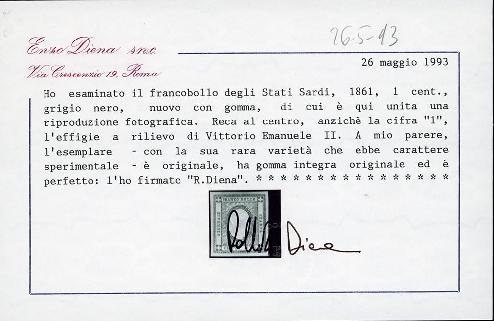 1861/1862 - 1 e 2 cent. grigio nero e 2 cent. bistro, i tre valori per stampati di Sardegna e Regno, con l'EFFIGIE al posto della cifra, francobolli sperimentali (10S, Sard.19S,20S), gomma originale integra, perfetti. Bellissimi. Cert. Diena e Finanziario Bolaffi 80%.