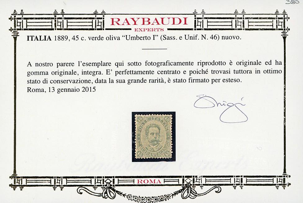 1889 - 45 cent. Umberto I (46), ottima centratura, gomma originale integra, perfetto. Raro in queste condizioni qualitative. Cert. E.Diena e Oro Raybaudi.