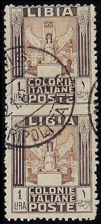 1926 - 1 lira Pittorica, dent. 11, coppia verticale non dentellata al centro (65h), perfetta, usata a Homs. Rara. Cert. E.Diena.