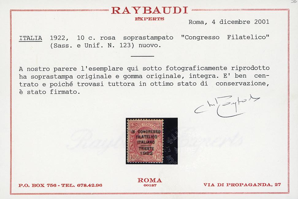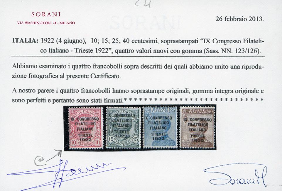 1922 - Congresso Filatelico, soprastampati, serie completa (123/126), buona centratura, nuovi, gomma originale integra, perfetti. Cert. Oro Raybaudi e Sorani (cat.Sassone 4.500/13.500 €).