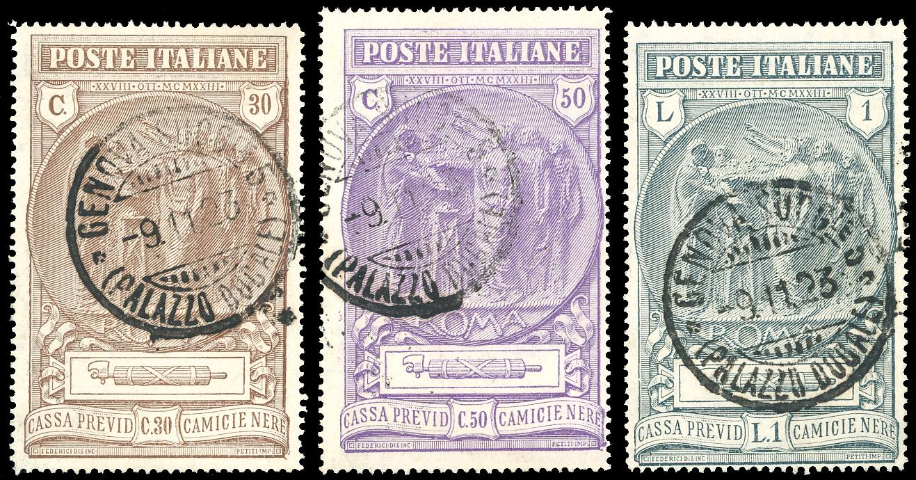 1923 - Camicie Nere, serie complete (147/149), perfetti, usati a Genova 9/11/1923. Ferrario.