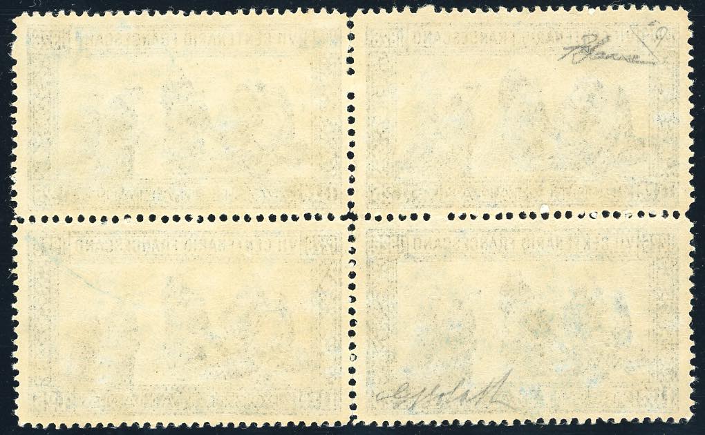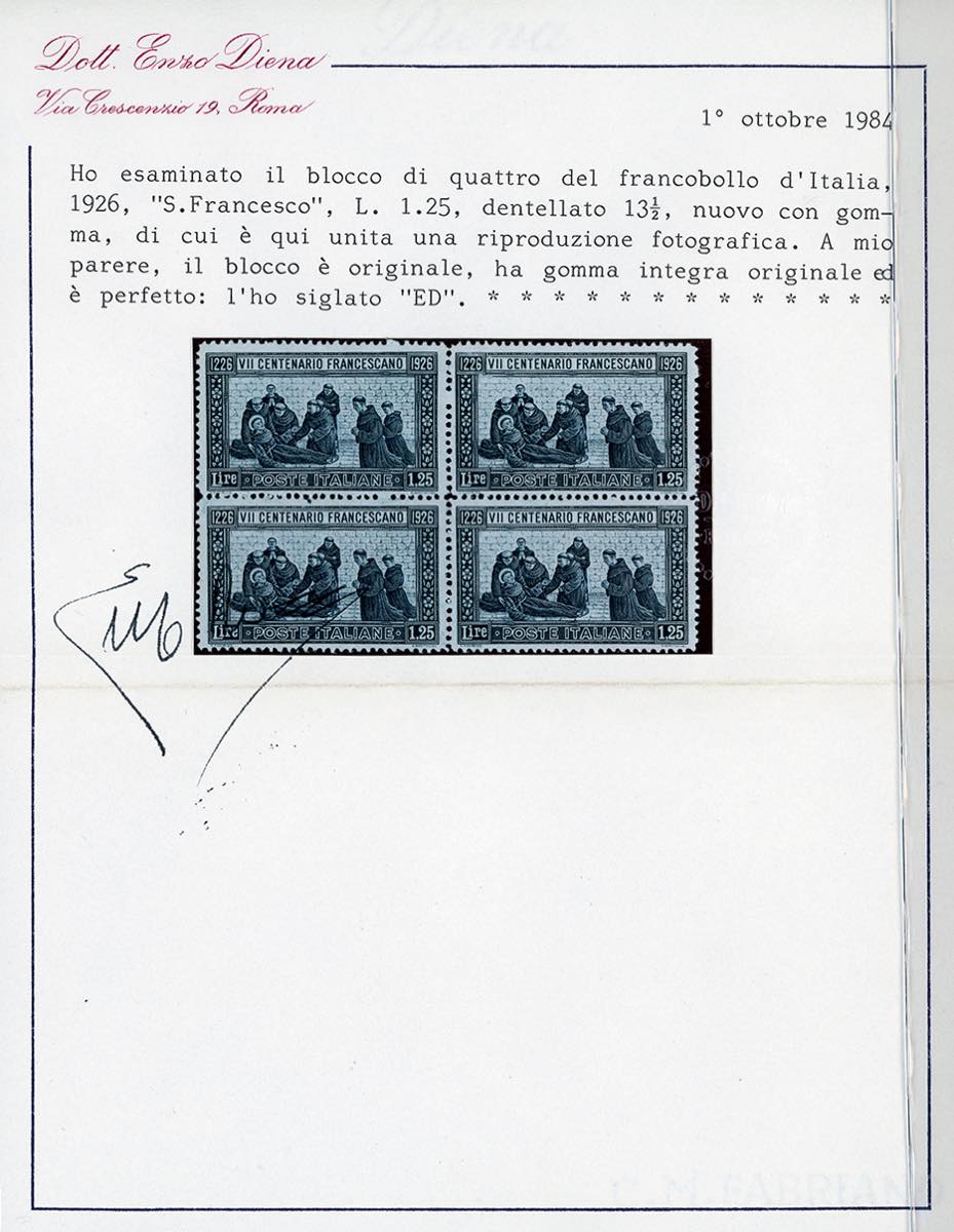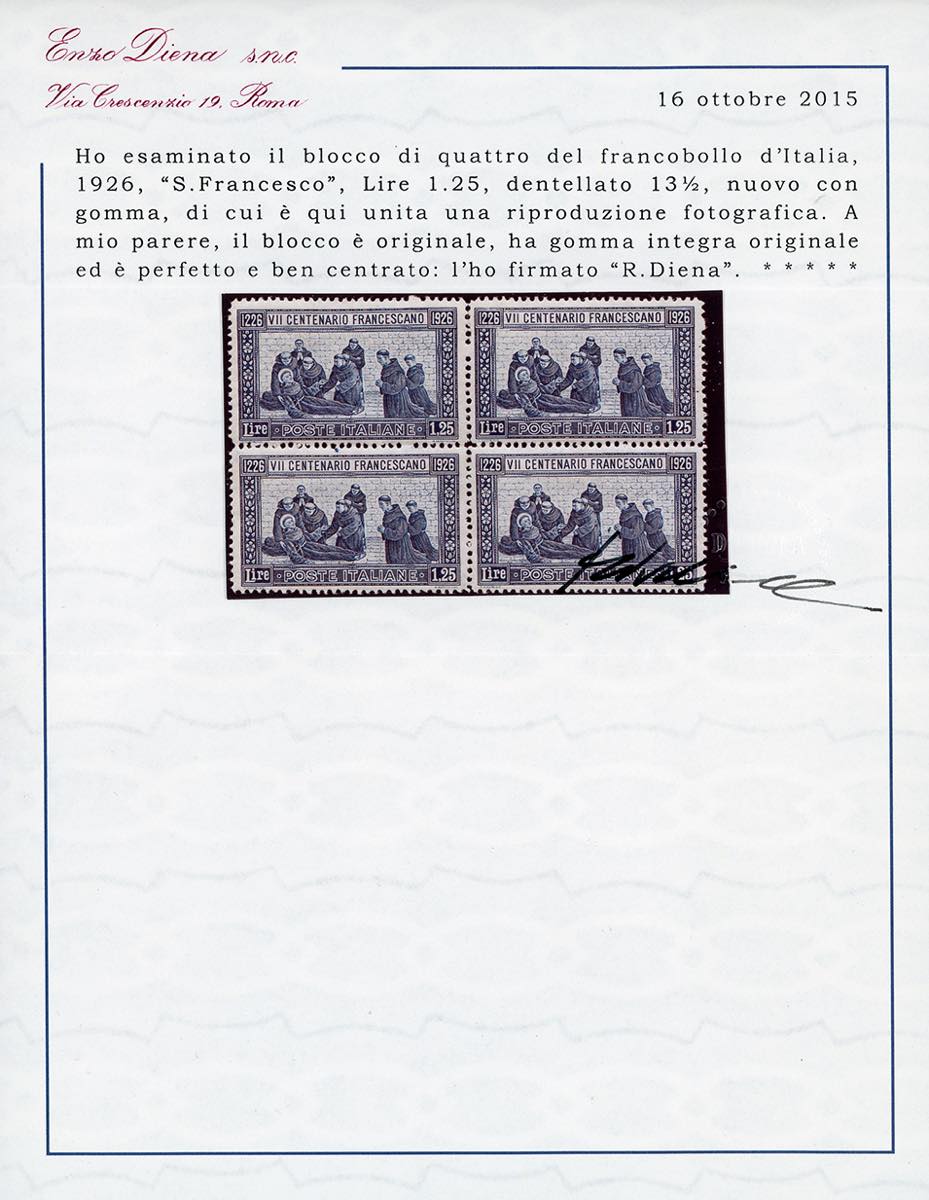 1926 - 1,25 lire San Francesco, dent. 13 1/2 (196), blocco di quattro, ben centrato, gomma originale integra, perfetto e molto fresco. G.Bolaffi, due cert. Diena.