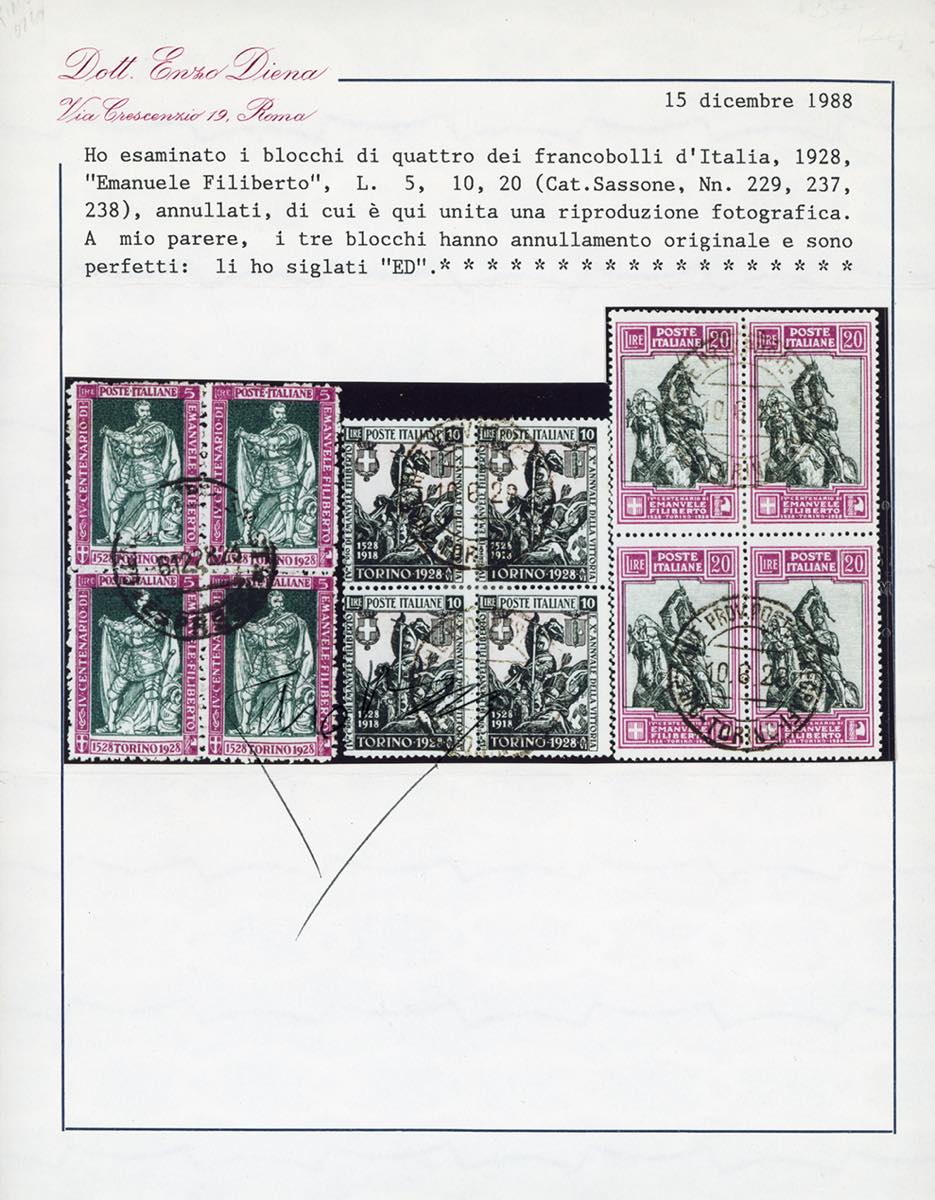 1928 - Emanuele Filiberto, serie di 10 valori con le dentellature più comuni (S.49), blocchi di quattro, usati, perfetti. Molto rari. Cert. E.Diena e Ferrario per i tre alti valori.