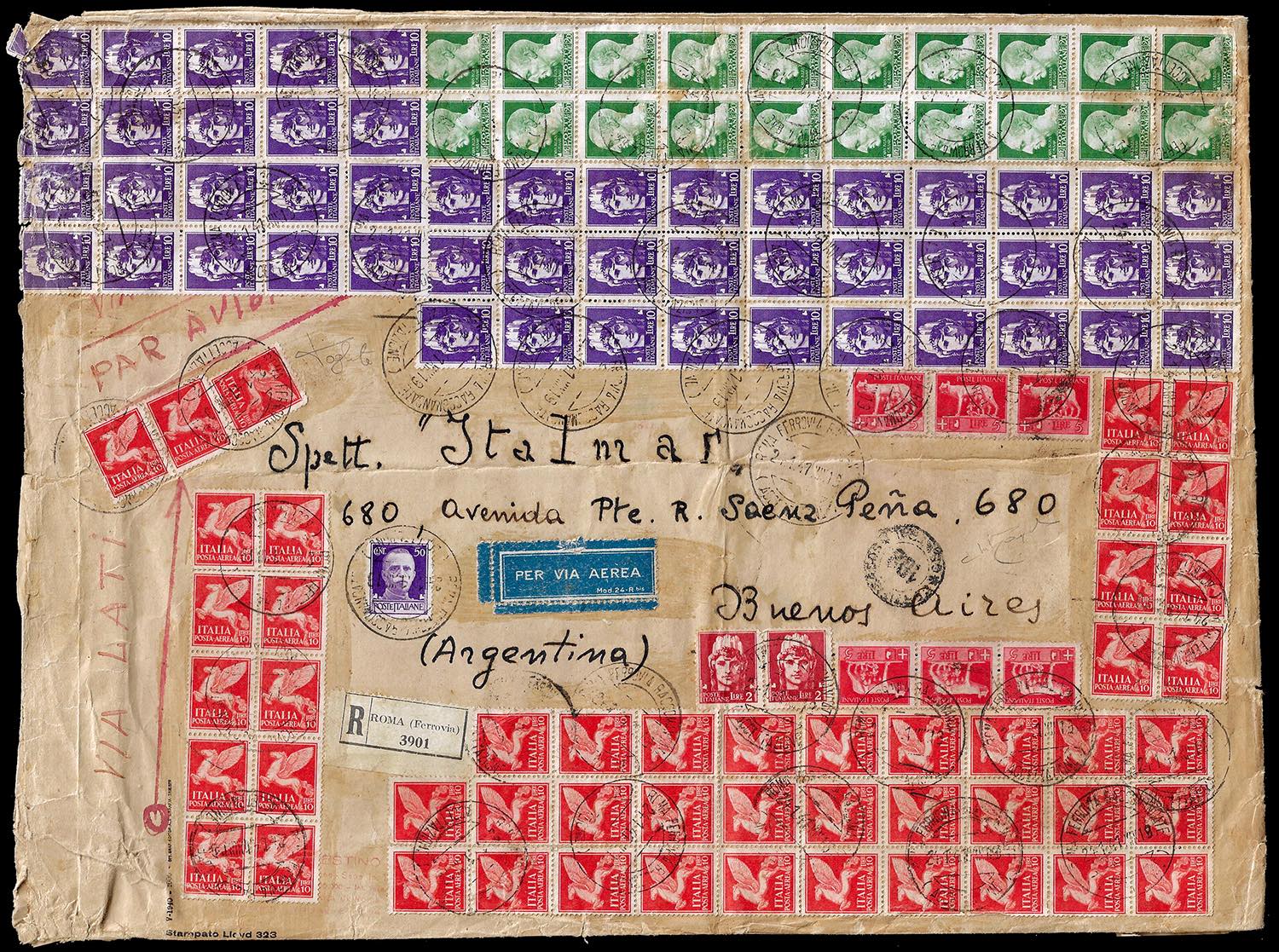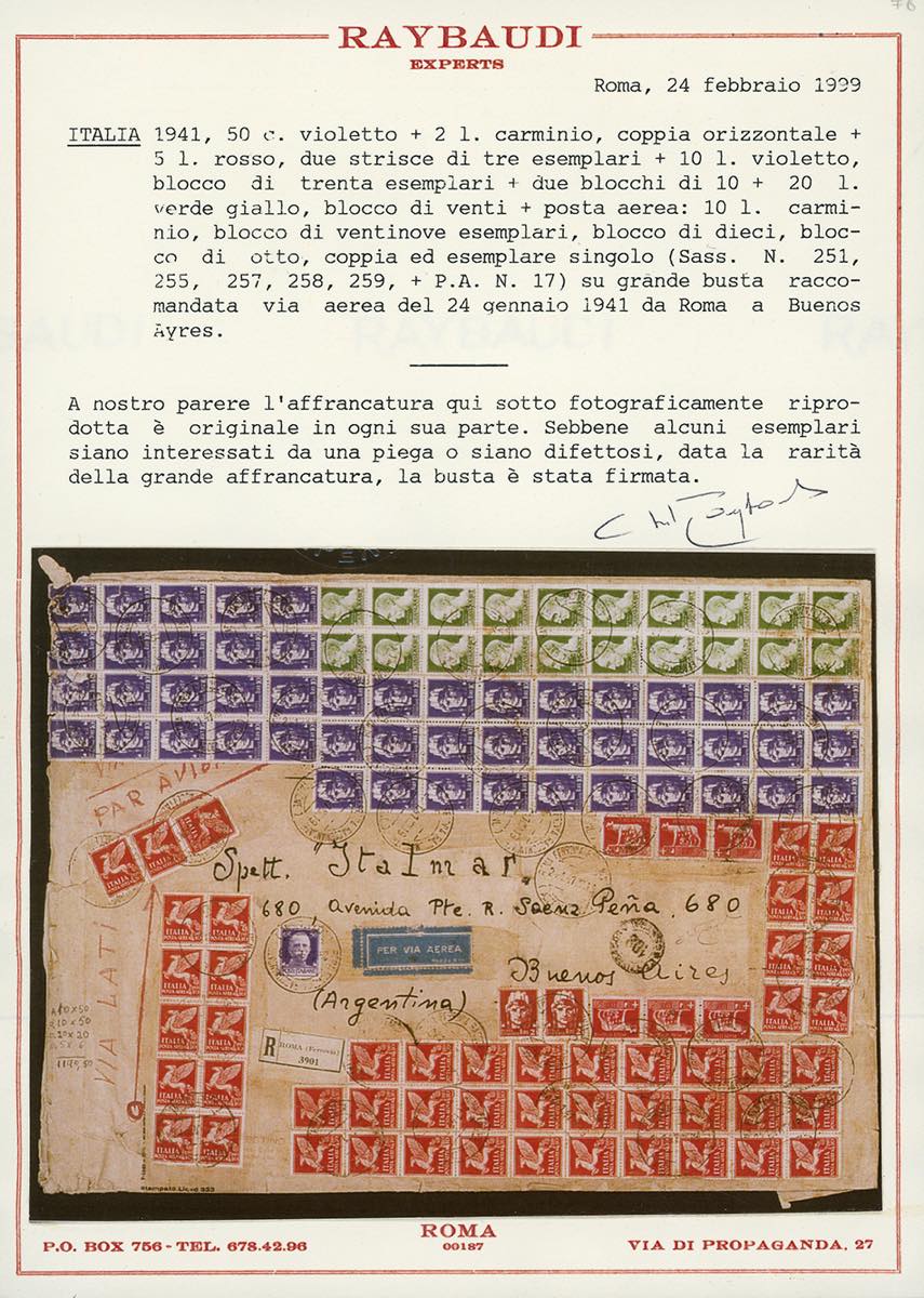 1941 - 20 lire blocco di venti esemplari, 10 lire blocco di trenta esemplari e due blocchi di dieci, 5 lire sei esemplari, 2 lire coppia, e 50 cent. Imperiale, 10 lire posta aerea blocco di ventinove, blocco di dieci, blocco di otto, coppia e singolo (259,258,257,255,251,A17), su aerogramma raccomandato da Roma 24/1/1941 a Buenos Aires. Eccezionale e spettacolare affrancatura multipla con valori gemelli. Cert. Raybaudi.