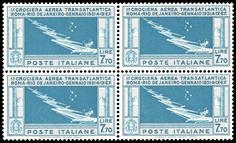 1930 - 7,70 lire Crociera Balbo (25), buona centratura, blocco di quattro, gomma originale integra, perfetto. Cert. E.Diena e Oro Raybaudi (cat.Sassone € 6.500/8.125).