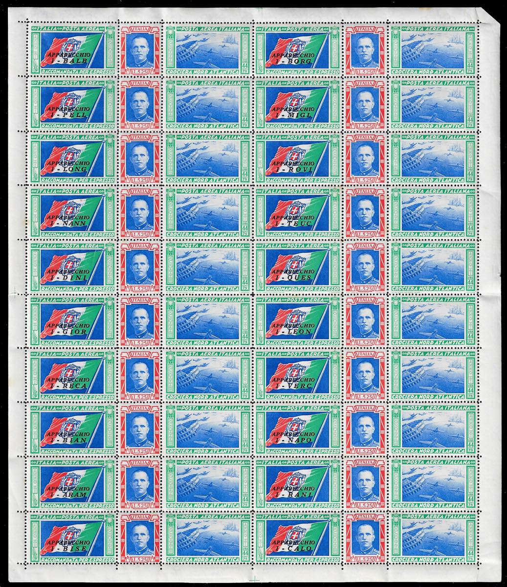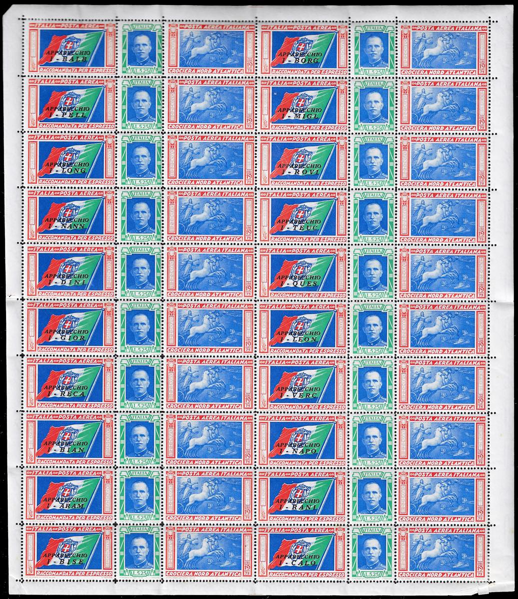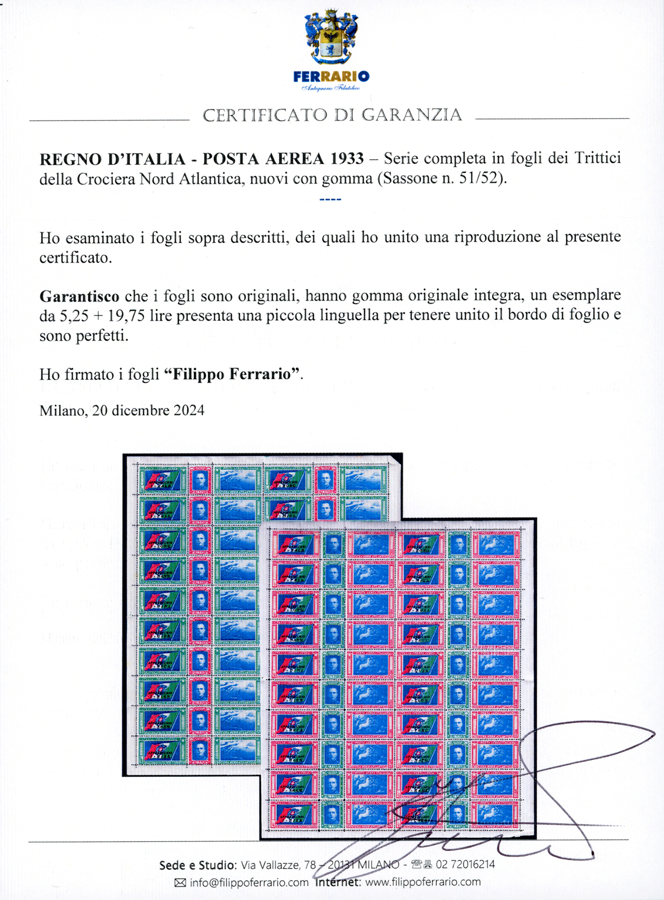 1933 - Serie completa in fogli dei Trittici della Crociera Nord Atlantica (51/52), gomma originale integra, perfetti, buona qualità. Un esemplare con leggera linguella per tenerlo unito al bordo di foglio. Cert. Ferrario.