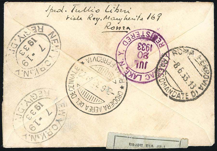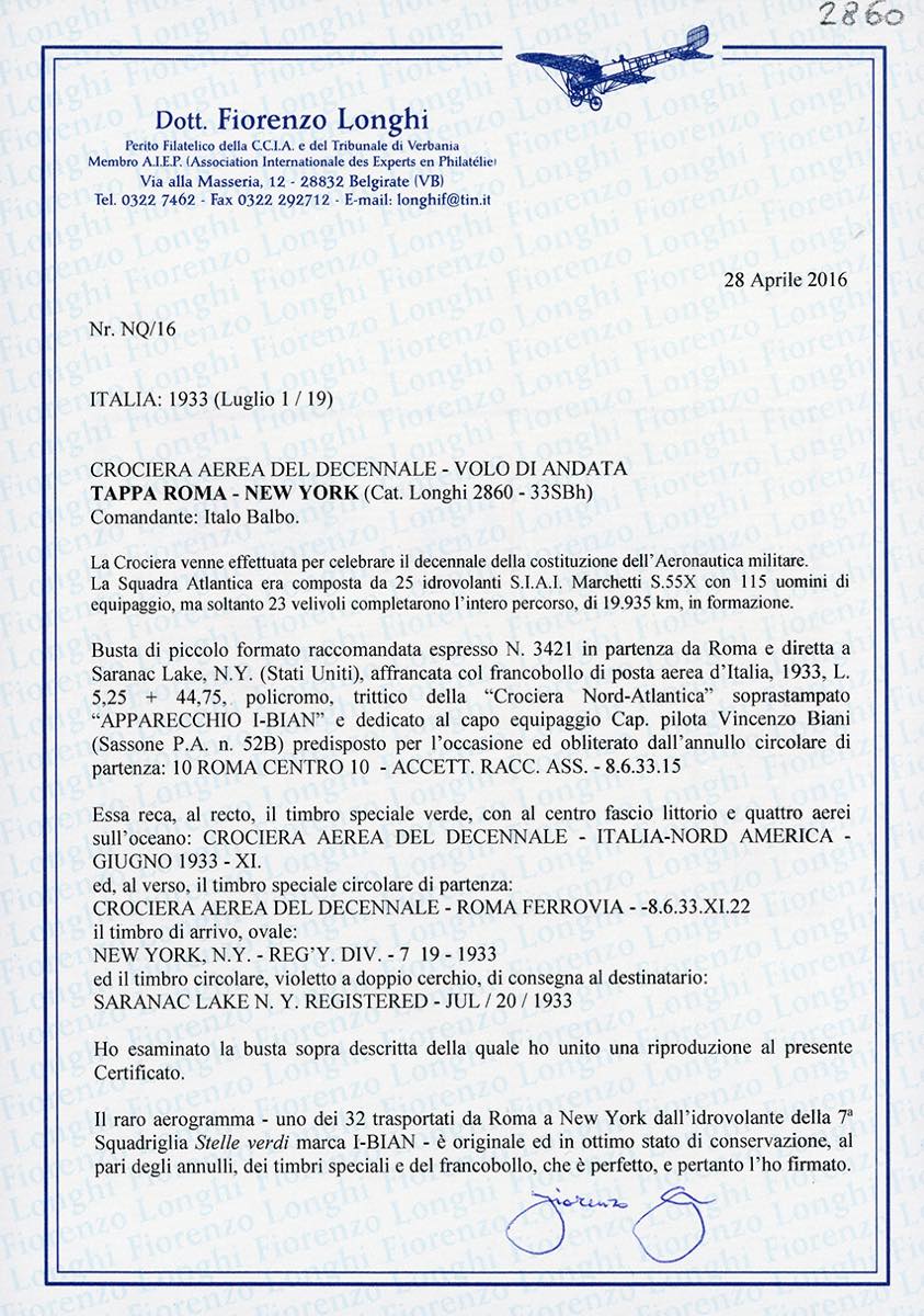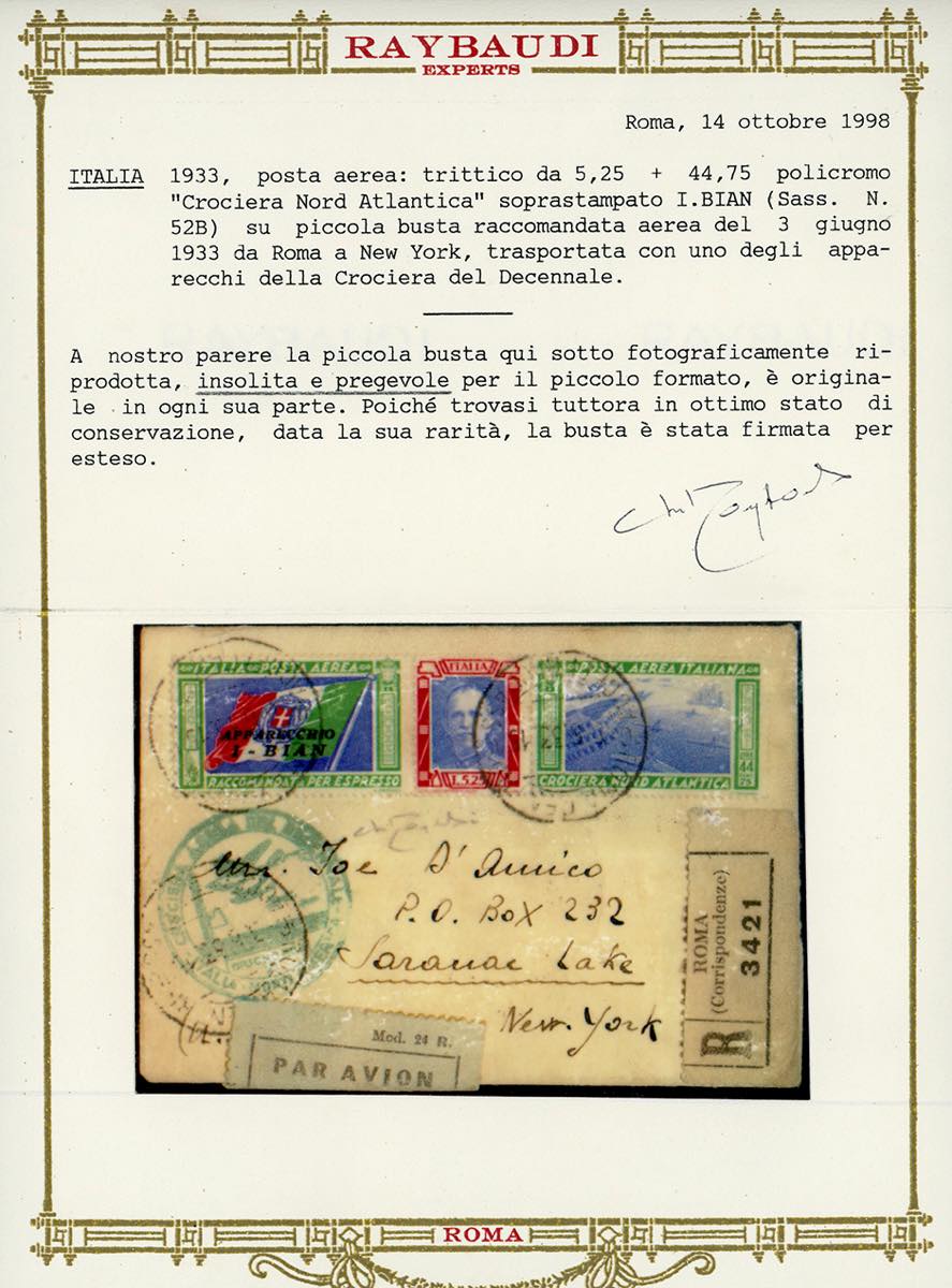1933 - 5,25 + 44,75 lire Trittico I-BIAN (52B), perfetto, su aerogramma raccomandato di piccolo formato da Roma 8/6/1933 a New York, bollo di arrivo al verso, bolli speciali della Crociera. Cert. Longhi e Oro Raybaudi.