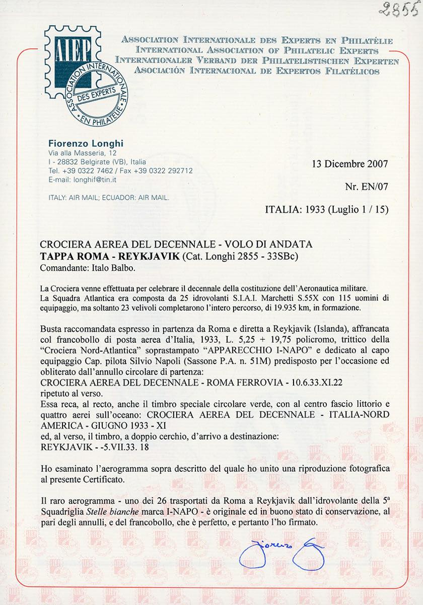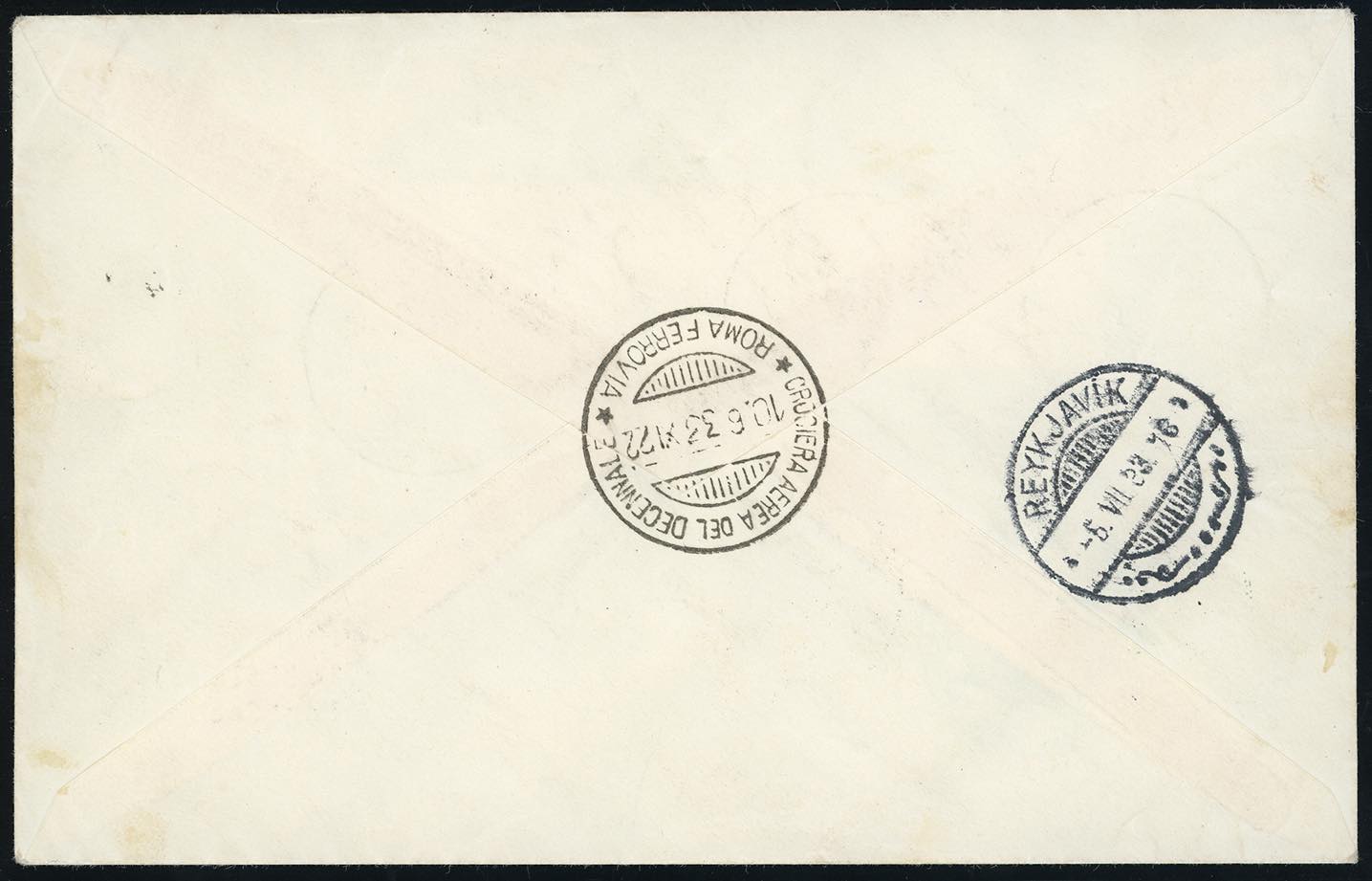1933 - 5,25 + 19,75 lire Trittico I-NAPO (51M), perfetto, su aerogramma raccomandato da Roma 10/6/1933, bollo speciale della Crociera, a Reykjavik, in Islanda, bollo di arrivo al verso. Molto bella. Cert. AIEP Longhi e Sorani.