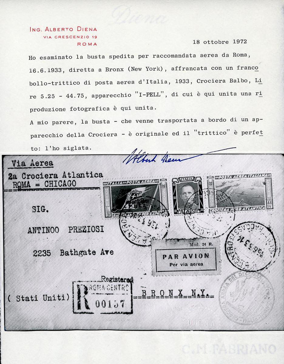 1933 - 5,25 + 44,75 lire Trittico I-PELL (52N), perfetto, su aerogramma raccomandato da Roma 16/6/1933 a New York, al verso bollo di transito di Chicago, bolli speciali della Crociera sul fronte e al verso. Cert. A.Diena.