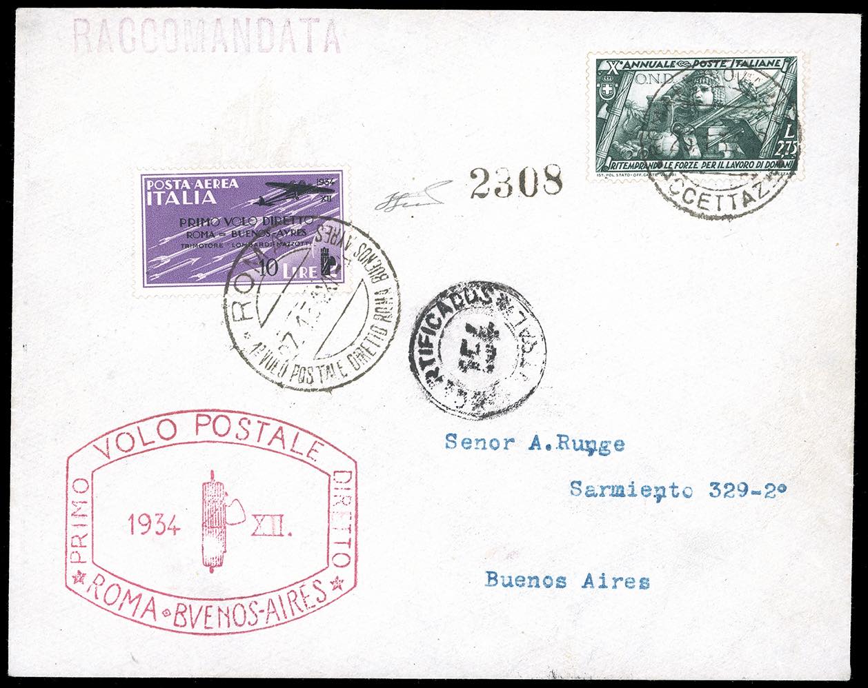 1934 - 10 lire Volo Roma-Buenos Aires, 2,75 lire Decennale (A59,312), perfetti, su aerogramma raccomandato da Roma 27/12/1934 a Buenos Aires, bollo speciale e al verso di arrivo. Molto bello. Ferrario.