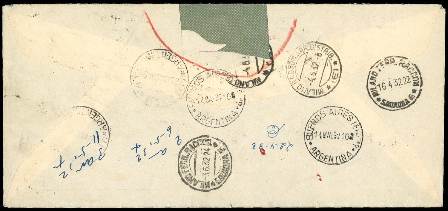 1932 - 2,75 lire, 50 cent., 1 lira, 3 lire, 5 lire, 7,70 + 2 lire Dante e 80 cent. Garibaldi (312,A26/A30,A33), perfetti, su aerogramma raccomandato da Milano 16/4/1932 a Buenos Aires in Argentina e ritornato al mittente, viaggiato con il dirigibile Graf Zeppelin, 3°Sudamerikafahrt, con bolli speciali, di transito e arrivo. Bell'insieme. Cert. Ferrario.