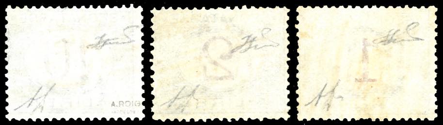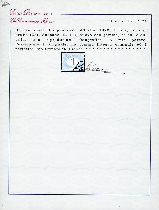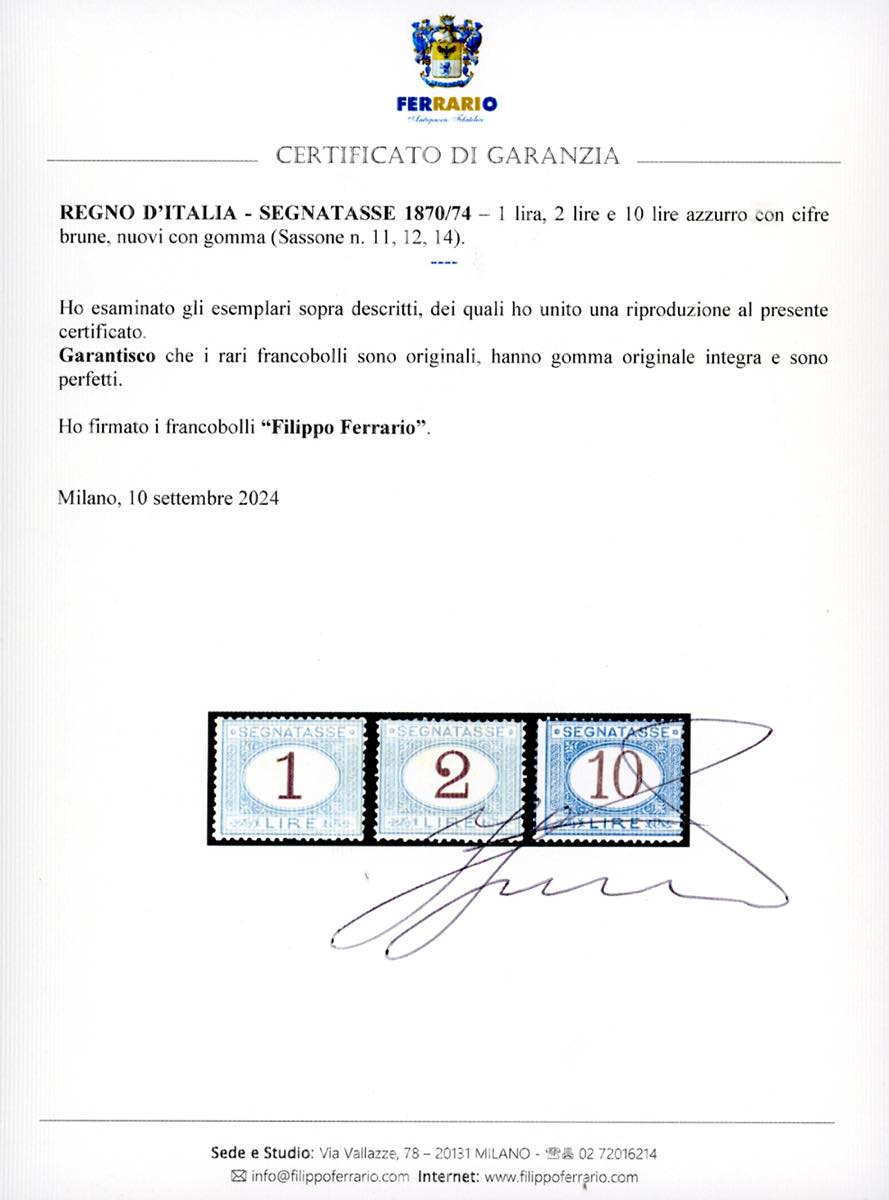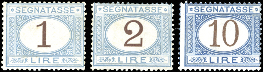1870/74 - 1 lira, 2 lire, e 10 lire azzurro cifre brune (11,12,14), nuovi, gomma originale integra, perfetti. Molto freschi e centratura sopra la media. Cert. Alberto e Raffaele Diena, Ferrario.