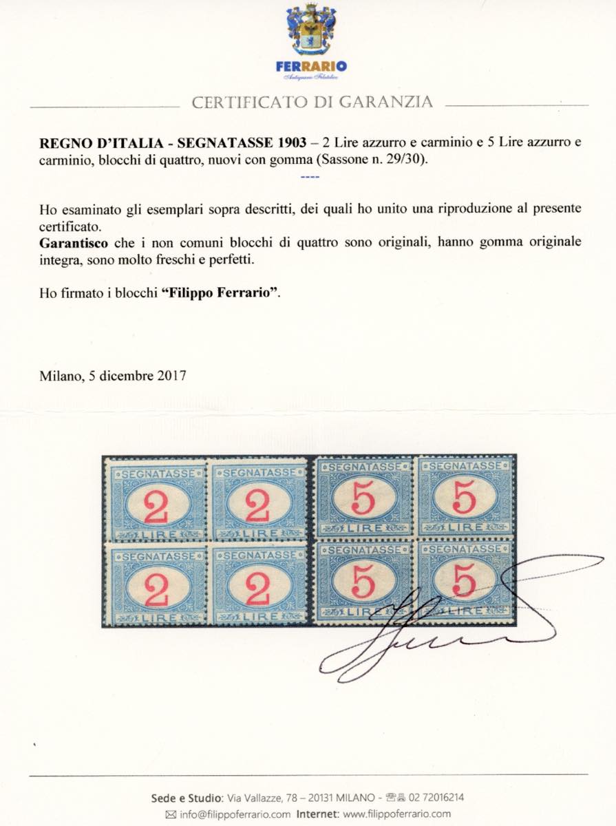 1903 - 2 e 5 lire azzurro e carminio (29/30), blocchi di quattro perfetti, gomma originale integra. Molto freschi e non comuni in blocchi. Cert. Ferrario.
