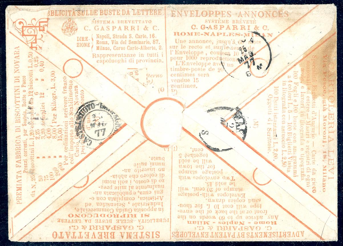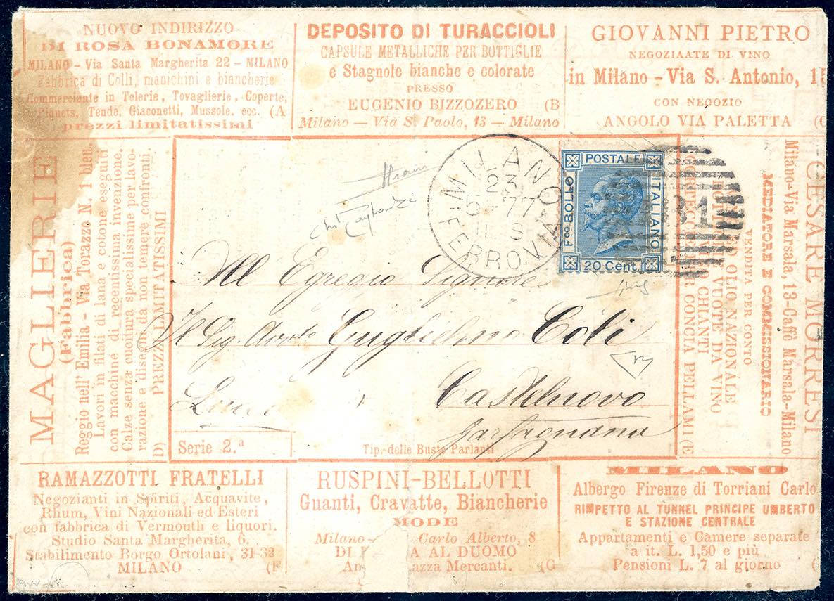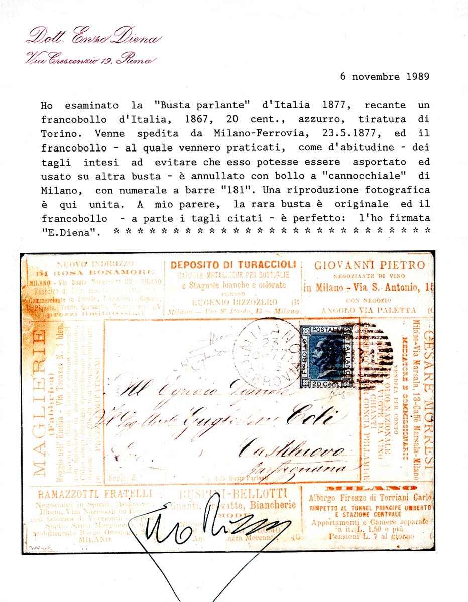 BUSTE PARLANTI CON NUMERO DI SERIE 1877 - 20 cent. azzurro (T26), su busta parlante con numero di serie e testi stampati in arancio (2), da Milano 23/571877 a Castelnuovo Garfagnana. Il francobollo presenta, come sempre, i consueti tagli di rasoio, ad evitarne una possibile asportazione, senza che costituiscano un difetto. Estremamente rara. Sorani, cert. E.Diena, Raybaudi e Fiecchi.