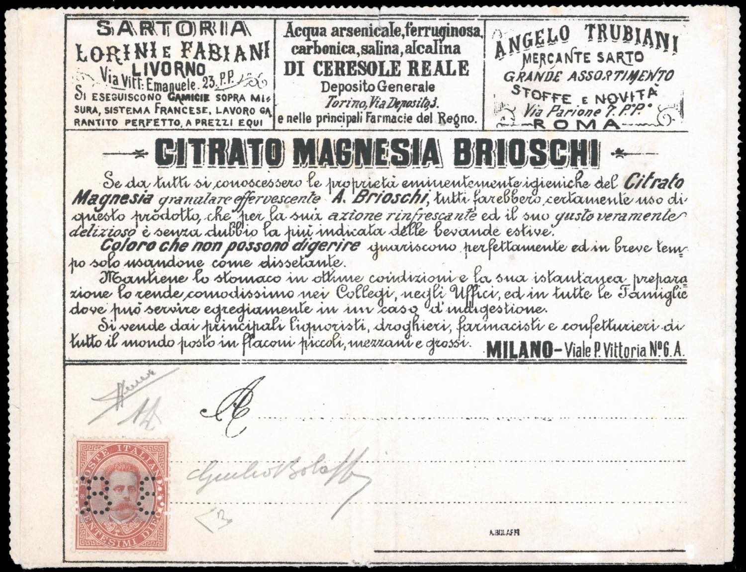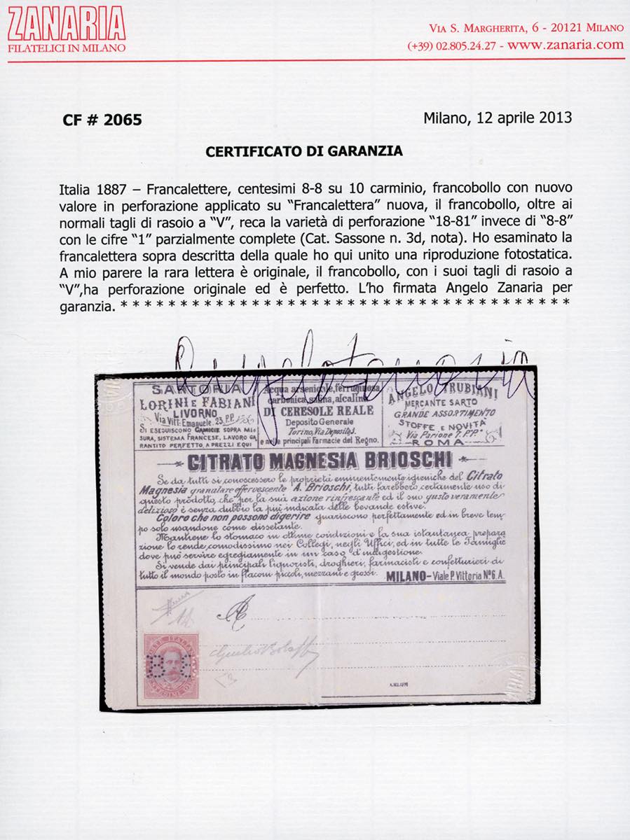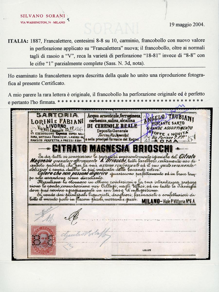 FRANCALETTERE 1887 - 8-8 su 10 cent., errore di perforazione "18-81" con le cifre "1" parzialmente incomplete (3d,nota), su busta francalettere nuova, perfetta, consueti tagli di rasoio sul francobollo per impedirne l'asportazione. Splendida e molto rara. Giulio Bolaffi per esteso, A.Diena, cert. Zanaria, E.Diena e Sorani.