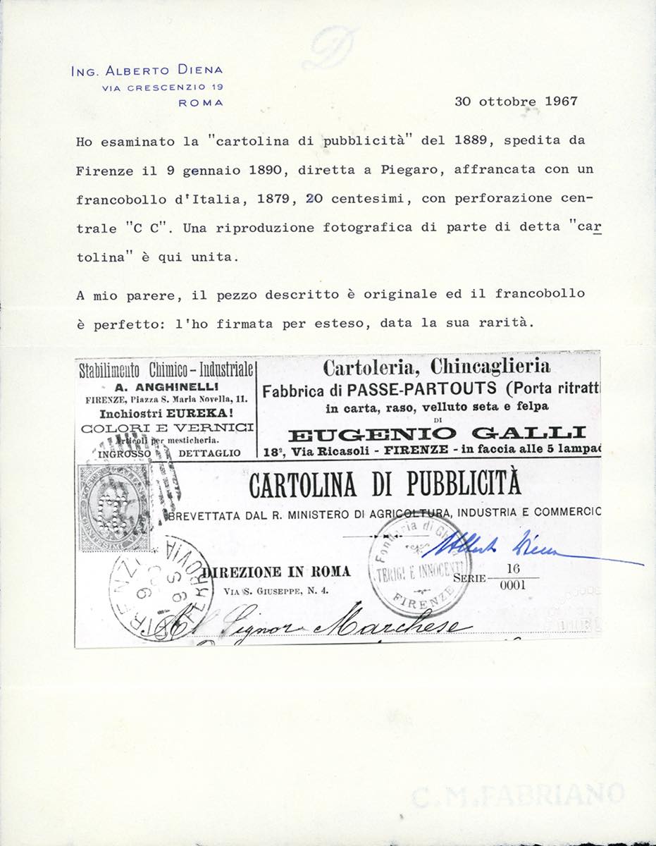 CARTOLINE DI PUBBLICITA' 1890 - 20 cent. Umberto I, perforato "CC" (1), su cartolina di pubblicità da Firenze 9/1/1890 a Piegaro. Questo tipo di cartolina reca generalmente le pubblicità di attività commerciali di Bologna. Questa con pubblicità di Firenze è estremamente rara e non catalogata. Per specialista. Ferrario, cert. A.Diena.