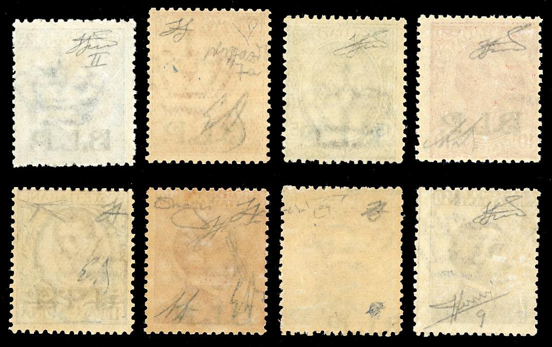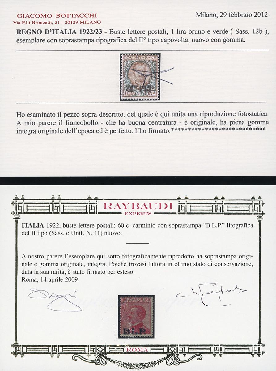 1922/23 - Soprastampa BLP, II tipo, serie completa, l'1 lira con soprastampa capovolta (5/6,7A,8/11,12b), gomma originale integra, perfetti. Raro insieme di ottima qualità. Ferrario per la serie, sei certificati di noti periti per i valori più importanti.