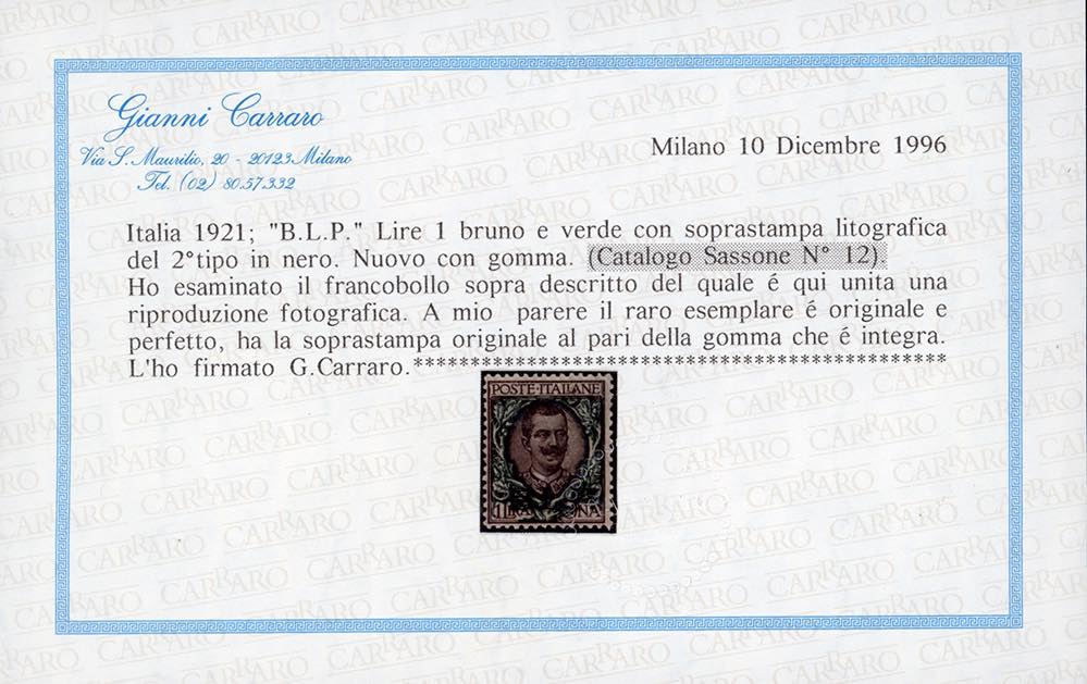 1922/23 - 1 lira soprastampa BLP del II tipo (12), ben centrato, gomma originale integra, perfetto e di ottima qualità. Emilio e Alberto Diena, Raybaudi, cert. Carraro.
