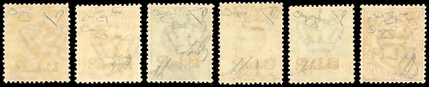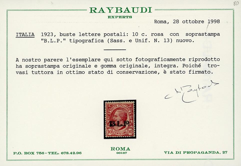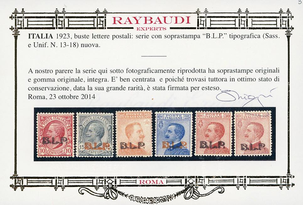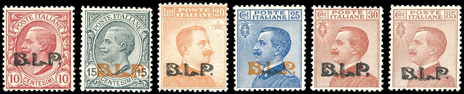 1921 - Soprastampati BLP, III tipo, serie completa (13/18), buona/ottima centratura, gomma originale integra, perfetti e molto freschi. Ottima qualità. Tutti firmati A. od E.Diena, cert. Oro Raybaudi.