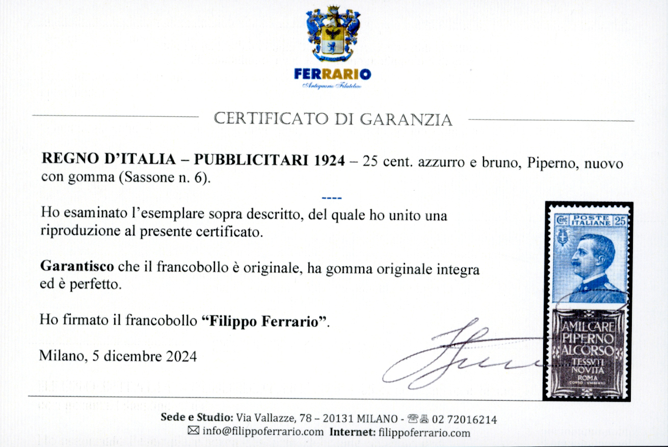 1924 - 25 cent. Piperno (6), gomma originale integra, perfetto. Cert. Ferrario.