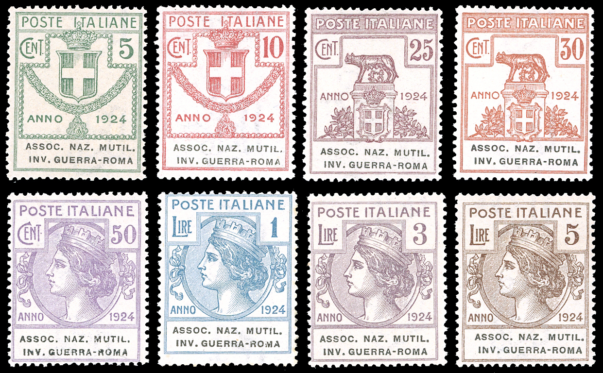 ASSOC. NAZ. Mutil. INV. GUERRA-ROMA 1924 - Serie completa (5/12), ben centrati, gomma originale integra, perfetti e di ottima qualità. A.Diena per il 3 lire, cert. Ferrario per i due alti valori, cert. Oro Raybaudi per il 5 lire.