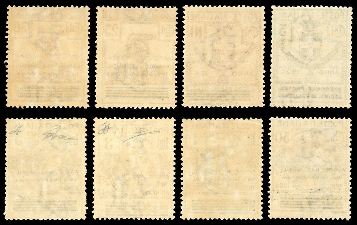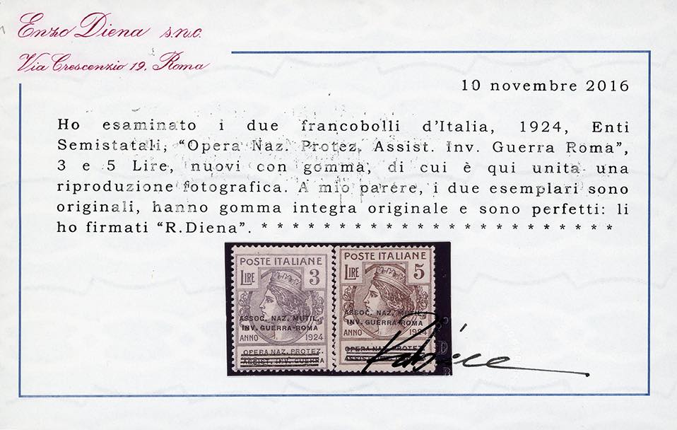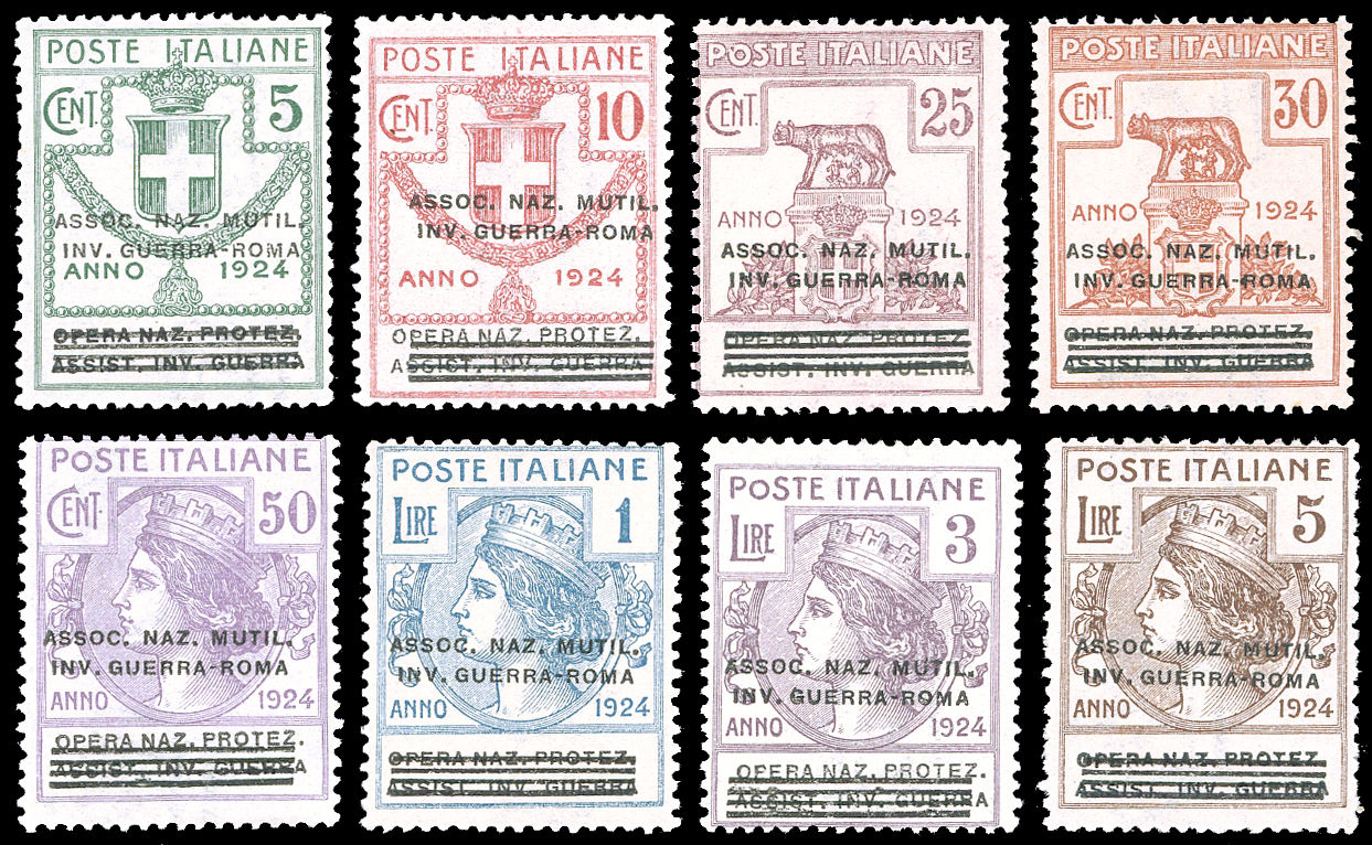 ASSOC. NAZ. MUTIL. INV. GUERRA-ROMA 1924 - Soprastampati, serie completa (70/77), gomma originale integra, perfetti. Ferrario e cert. Diena per i due alti valori.