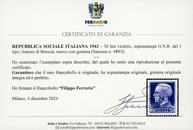1943 - 50 lire, soprastampa G.N.R. di Brescia, I tipo (489/I), nuovo, gomma originale integra, perfetto. Raro e di ottima qualità, tiratura 100 esemplari. Fiecchi, cert. Diena e Ferrario.
