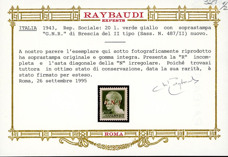 1943 - 20 lire soprastampa G.N.R. di Brescia, II tipo (487/II), varietà lettera "R" incompleta, posizione 19, gomma originale integra, perfetto. Estremamente raro, DUE SOLI ESEMPLARI NOTI CON QUESTA VARIETA', non catalogato. G.Oliva, cert. Andreoni e Oro Raybaudi.