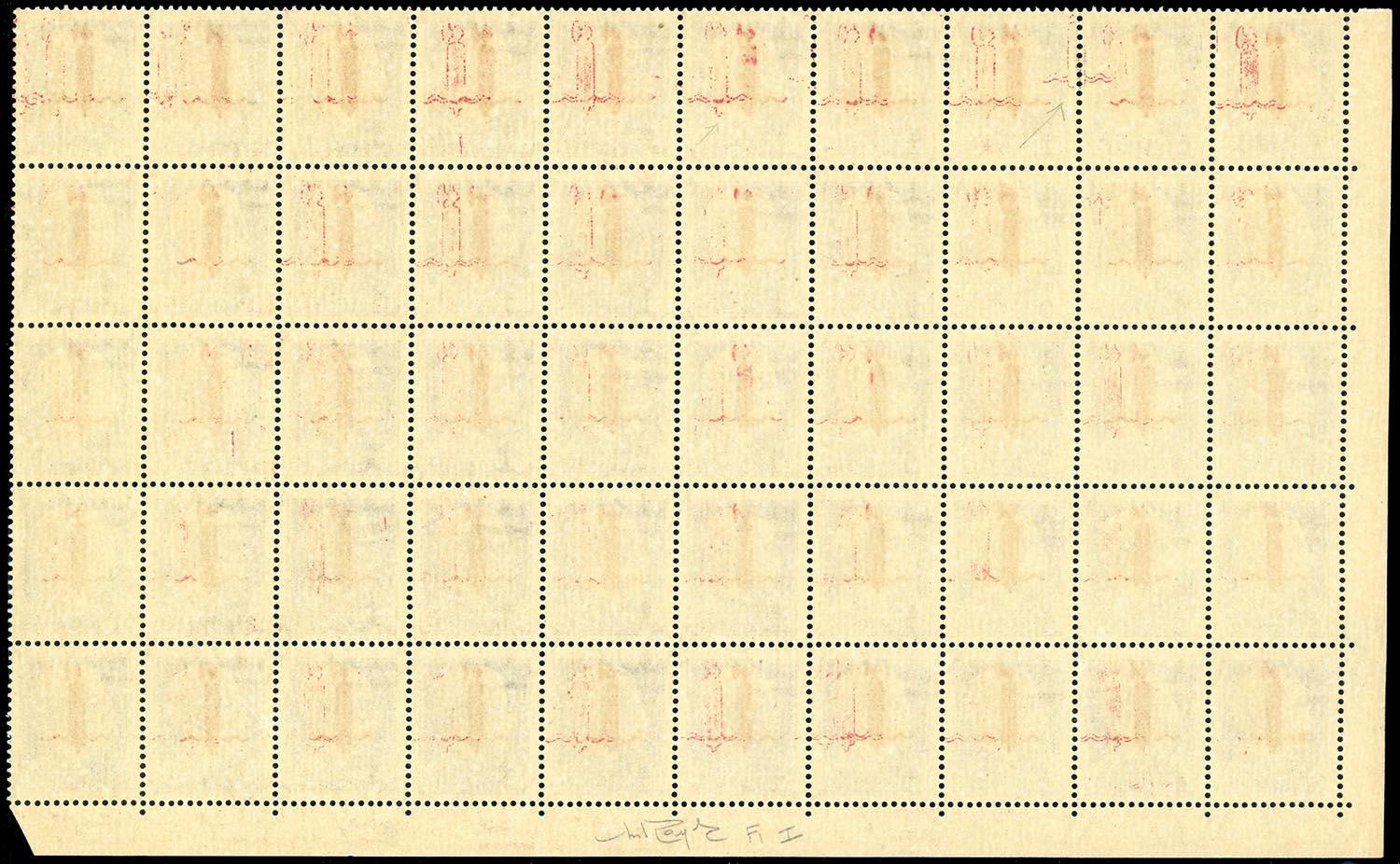 1944 - 1,25 lire, soprastampa fascio in carminio lillaceo di Firenze (495/I), blocco di 50 esemplari, una ventina con decalco parziale della soprastampa al verso, angolo di foglio con numero di cilindro, gomma originale integra, perfetto. Raro. Ferrario. Cert. Raybaudi.