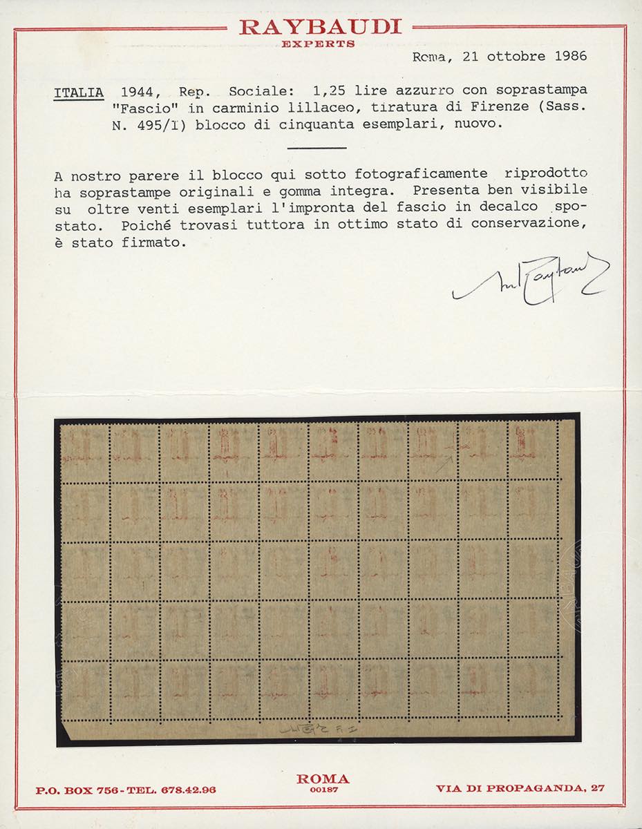 1944 - 1,25 lire, soprastampa fascio in carminio lillaceo di Firenze (495/I), blocco di 50 esemplari, una ventina con decalco parziale ... Leggi tutto
