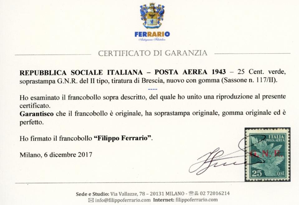 1943 - 25 cent. soprastampa G.N.R. di Brescia, II tipo (117/II), nuovo, gomma originale, perfetto. Raro. Cert. Ferrario.