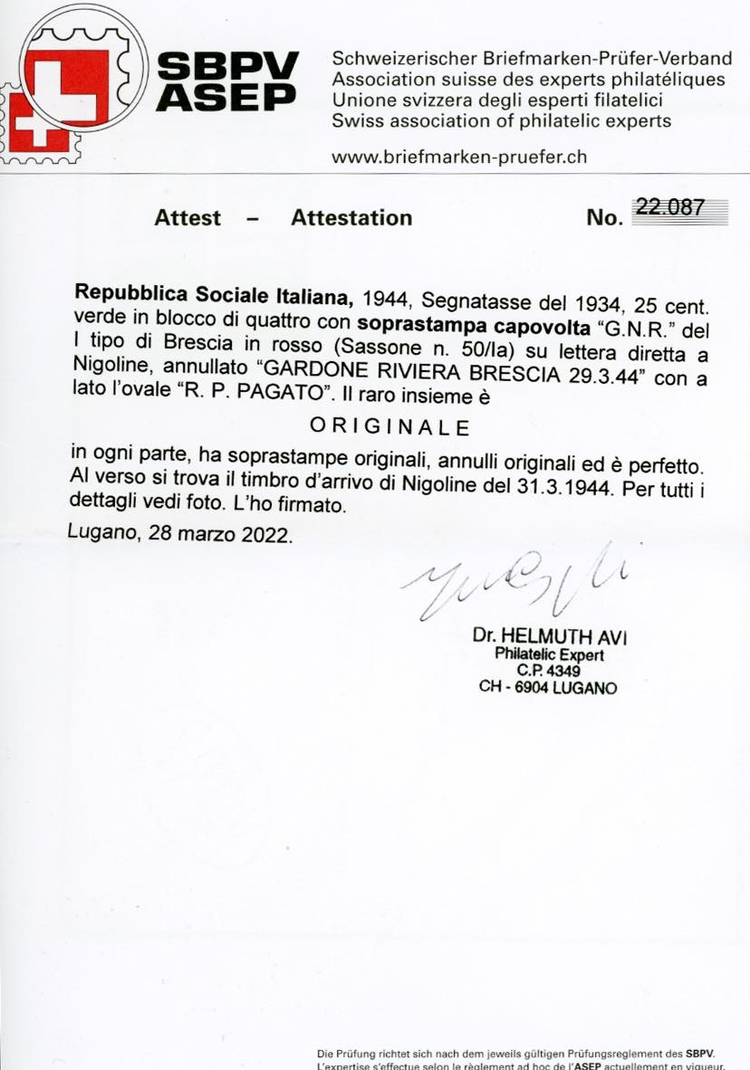 1944 - 25 cent. soprastampa G.N.R. capovolta di Brescia, I tipo (50/Ia), blocco di quattro, perfetto, su busta da Gardone Riviera 29/3/1944 a Nigoline, bollo d'arrivo. Si conoscono solo tre blocchi di quattro usati su busta, questa è l'unica quartina isolata. Grande rarità del settore. Cert. Avi.