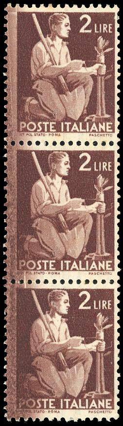 Lotto 1134 - 1945 - 2 lire Democratica (552), striscia verticale di tre, ...