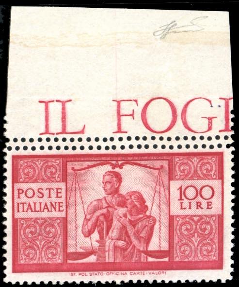 1946 - 100 lire Democratica, I lastra, dent. 14 1/4 x 14 1/4, carta bianca, pos. 3 doppia dentellatura orizzontale in alto (Sass.spec.25aEi), bordo di foglio, gomma originale integra, perfetto e molto fresco. Ferrario.