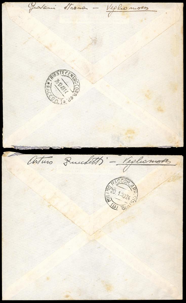 1949/50 - Volta, serie completa (611/612), blocchi angolari di 5, perfetti, ciascuno su busta raccomandata da Veglio Mosso, il 20 lire in data 22/10/1949 per Trieste, il 50 lire in data 19/1/1950 per Milano, entrambe con bollo d'arrivo. Insieme estremamente raro, probabilmente unico. Cert. Ferrario.