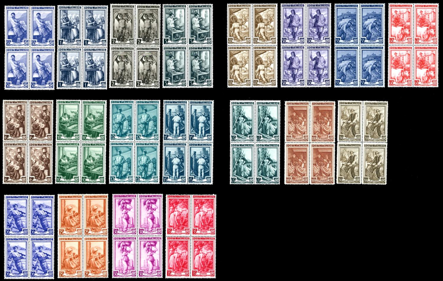 1950 - Lavoro, filigrana ruota, serie completa (634/652), ottima centratura, blocchi di quattro, gomma originale integra, perfetti. Cert. Diena per gli alti valori.
