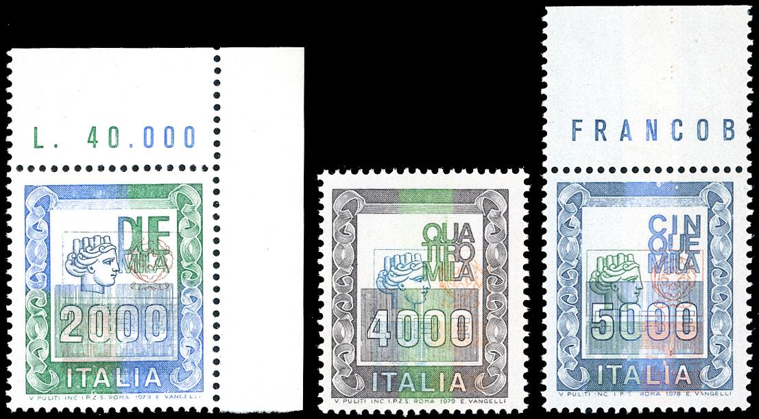 1978 - 2.000 lire, 4.000 lire e 5.000 lire Alti Valori, tutti con effigie al centro fortemente spostata (1439c,1441a,1442c), gomma originale integra, perfetti. Ferrario.